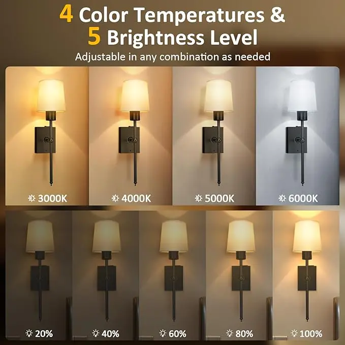 【4 Color Temperatures & Brightness Adjustable】This rechargeable wall sconce offers 5 levels of brightness settings(20%~100%), 4 adjustable color temperatures (3000K/4000K/5000K/6000K), allows you to customize the lighting ambiance of this battery powered wall sconce according to your own preferences, creating the desired atmosphere for any occasion.