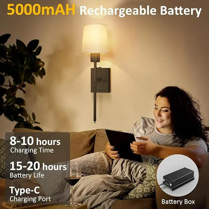 【Battery Operated Wall Sconces Set of Two】This wireless wall sconce comes with 2 energy saving E26 bulbs, 300LM comfortable brightness. Unlike other battery wall sconce set of 2, we use a detachable 5000mAh rechargeable battery box, long-lasting, durable and easier to operate, 15-20 hours of continuous illumination at maximum brightness, perfect for blending into any indoor area, creating a relaxing, pleasant and comfortable atmosphere.