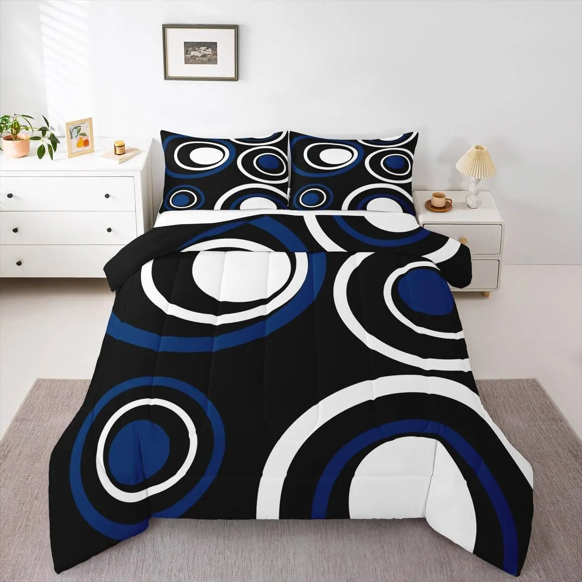 5. Black Blue Vortex Bedding Set for Adult Women Men Chic Geometric Abstract Mens Comforter Set,Striped Aesthetic Circles Quilt Duvet Set