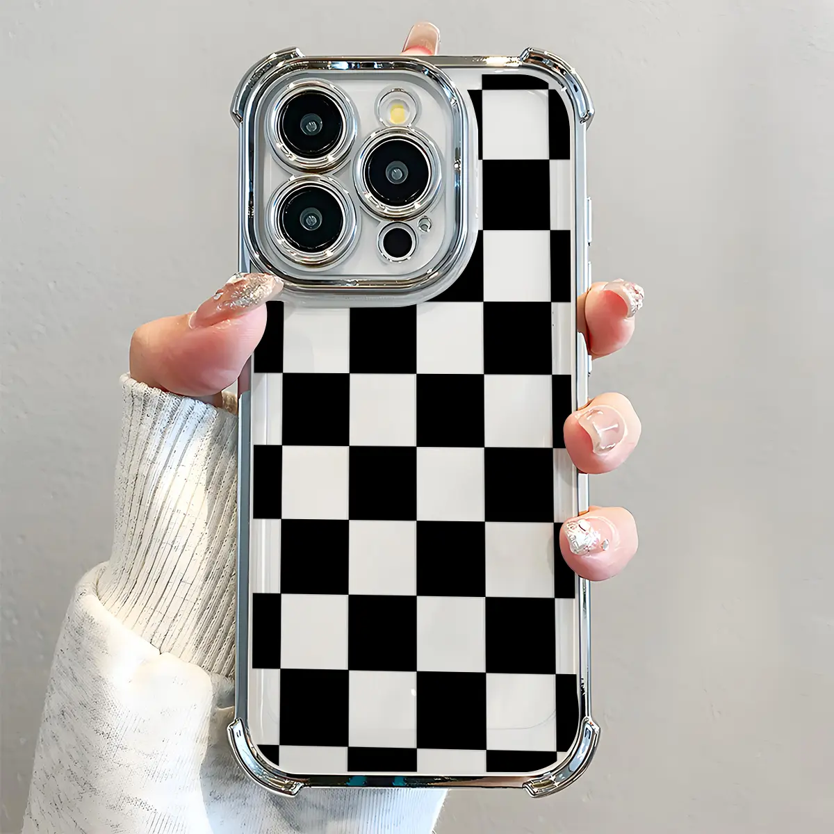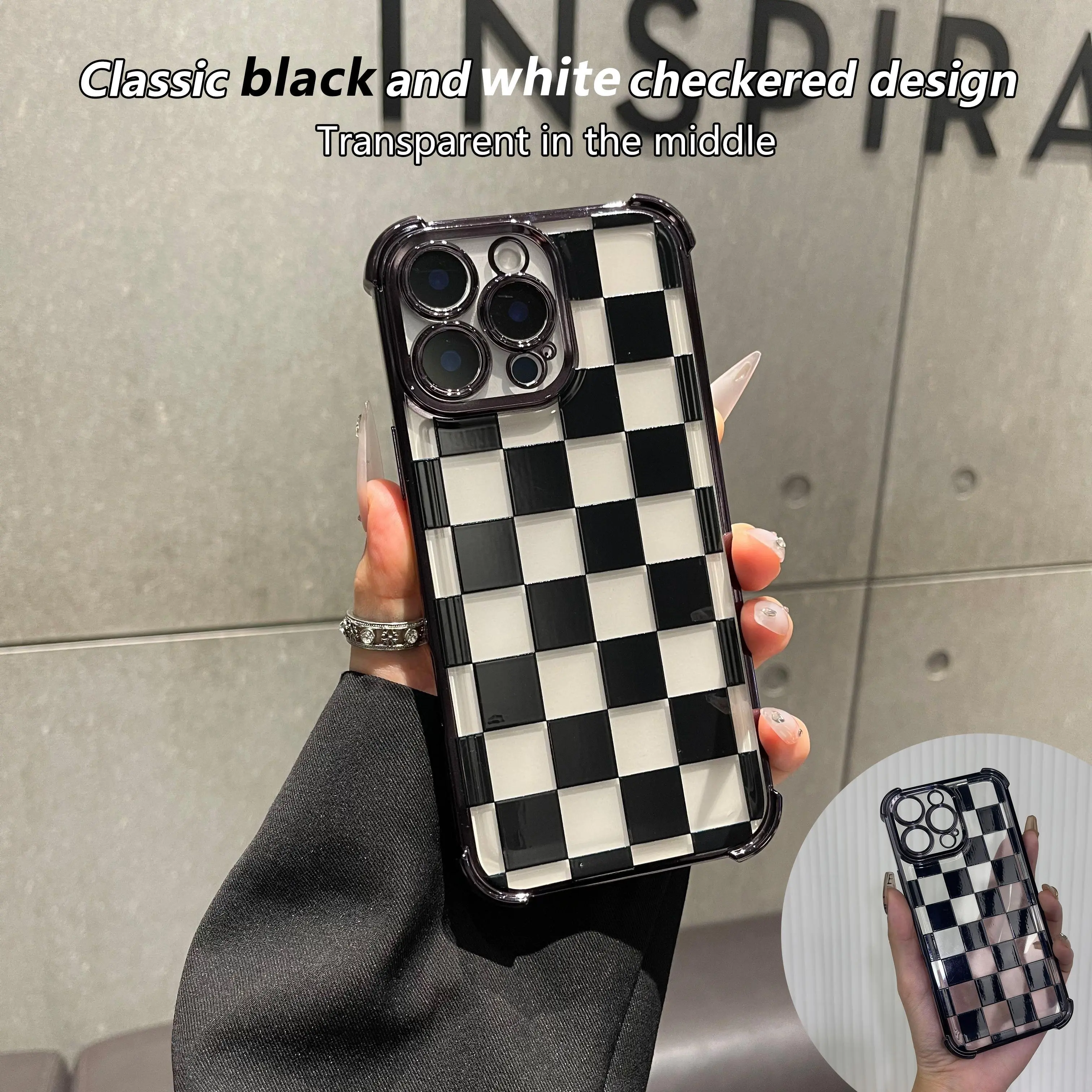 Black Checkered Pattern Phone Case , Electroplated Cover with Airbag Shockproof Slim Soft TPU Cover for iPhone X XS 11 12 13 14 15 16 17 Pro Max Plus Air Stylish