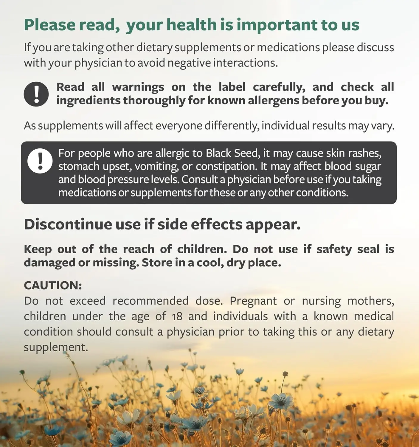 ·Manufactured to immaculate standards: We source our black seed oil from its natural growing regions in Turkey and Israel, and bottle it in a GMP-certified facility right here in the USA, so you can be certain that inside every bottle is nothing but pure, organic, cold-pressed black seed oil.