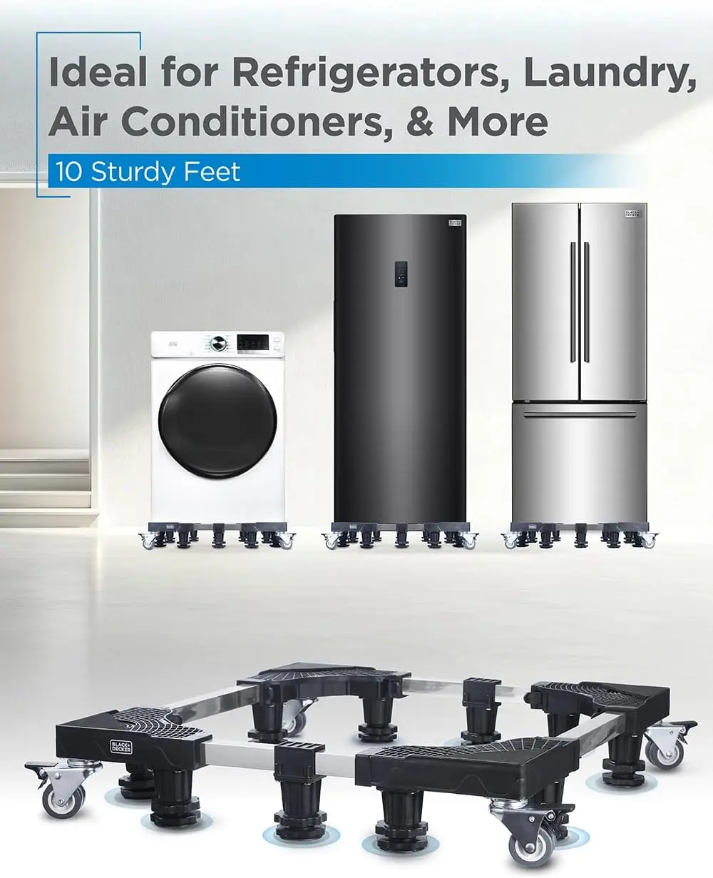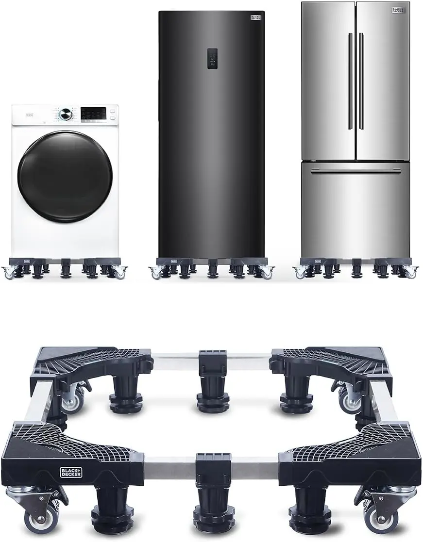 The BLACK+DECKER Multi-Functional Base, an essential accessory for your household and apartment needs. This versatile pedestal stand is designed to provide robust support for a variety of major appliances, including portable air conditioners, full-size top-mount refrigerators, and washing machines and dryers. This portable air conditioner stand is built to support up to an impressive 700 lbs., ensuring stability and reliability for all your home appliances. Constructed with four thickened square stainless-steel poles, this dryer stand is a testament to strength and endurance. The heavy-duty design is complemented by 10 sturdy adjustable leveling feet, which allow for seamless height adjustments from 4 to 4.6 inches. 4 locking swivel casters allow smooth movement when needed. This feature ensures that the Multi-Functional Base perfectly adapts to your specific needs, providing a solid and balanced foundation for your appliances. The thoughtful inclusion of shock-absorbing friction pads enhances the stability of this fridge stand, offering additional corner surface support to mitigate vibrations and noise. Whether you are seeking a refrigerator stand or a water dispenser stand for your kitchen, this base provides the versatility and functionality you require. The push buckle locking supports and built-in level correction on each triangular panel ensure effortless setup and precise alignment, accommodating an adjustable length and width range of 24” to 31”. Further enhancing its utility, this washer and dryer pedestal can support a variety of appliances such as full-size laundry washers and dryers, making it an indispensable addition to your laundry room.