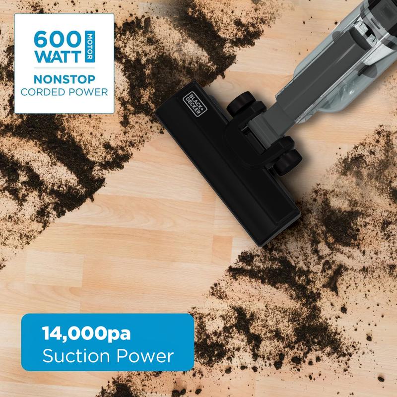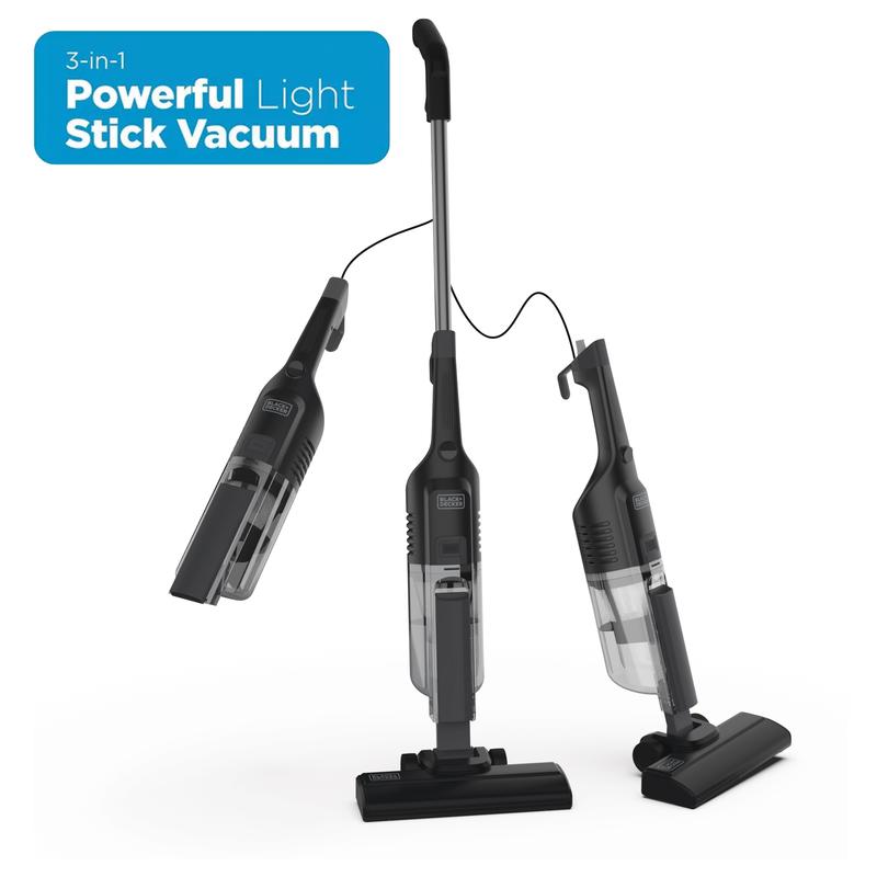 Tired of bulky vacuums that are hard to maneuver? Our 3-in-1 Stick Vacuum offers a lightweight, powerful solution for your home cleaning needs. Equipped with a 600W motor, this vacuum cleaner delivers strong suction power to capture both large and small debris with ease. Its versatile design allows it to tackle a variety of surfaces, from hardwood floors to carpets, making it an ideal choice for any stick vacuum user. This stick vacuum is designed with convenience in mind, featuring a 21-foot cord for extended reach, minimizing the need to unplug and replug while cleaning. The easy-to-empty 500ml dustbin of our vacuum ensures hassle-free maintenance, making it a reliable small vacuum cleaner for everyday use. Clean your home with the powerful Black + Decker 3-in-1 Stick Vacuum. The 3-in-1 design easily converts this stick vacuum into a hand vacuum, allowing you to clean furniture, stairs, and other hard-to-reach areas effortlessly. The vacuum cleaner’s swivel steering and lightweight build enhance maneuverability, making it easy to tackle tight corners and under-furniture spaces. Designed to simplify your life, this vacuum cleaner features a single power button for easy operation, along with self-standing capability for convenient storage. The cord wrap ensures clutter-free organization, making it a great addition to any home cleaning kit. The 3-in-1 Stick Vacuum Cleaner combines power, versatility, and ease of use to deliver an exceptional cleaning experience. With its strong performance and versatile features, this carpet vacuum is a reliable tool for keeping your space spotless. Keep your home free of mess and dust with Black + Decker 3-in-1 Stick Vacuum. Add it to your cart today!