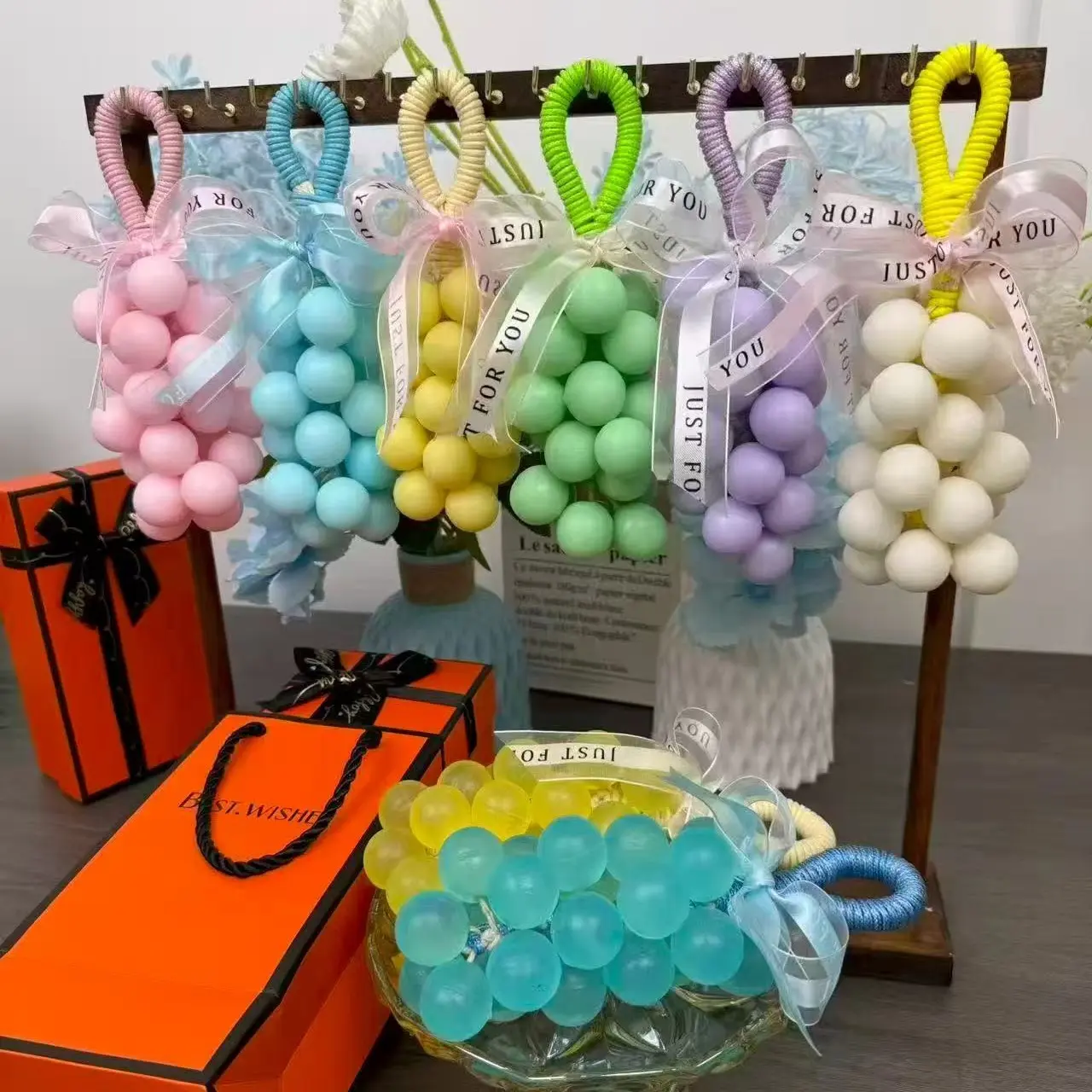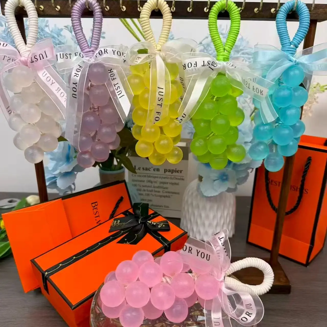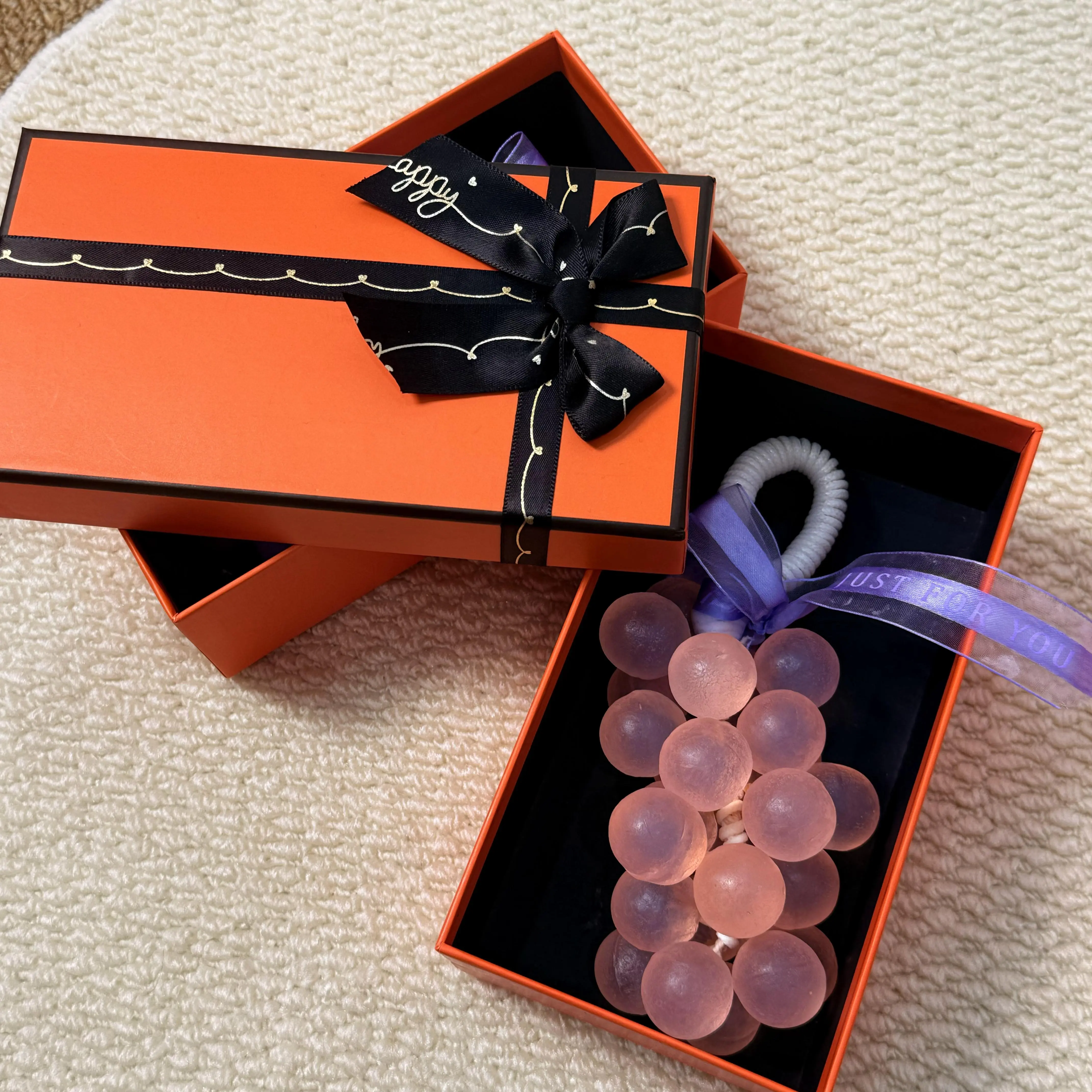I received my grape soaps today wow absolutely beautiful. I was so impressed by the wrapping the box. Everything was absolutely gorgeous. The smell is amazing. I could smell it right through the plastic. They are very well-made very detailed. I am super happy with them. I will definitely be purchasing from the seller for gifts. They make absolutely beautiful gifts specially the way they represent when they send them to you the box the carrying bag just beautiful thank you so much happy holidays. I absolutely recommend this seller.A++++