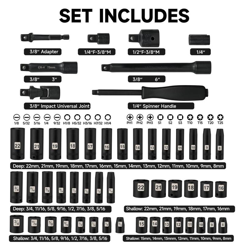 This 72-piece set covers both Metric (8-22MM) and SAE (5/16"-3/4") needs. It includes 6-point impact sockets, 3/8" drive extension bars, adapters, universal joints, and other accessories. Ideal for bolt/nut removal and installation in automotive repair, home assembly, and other scenarios.