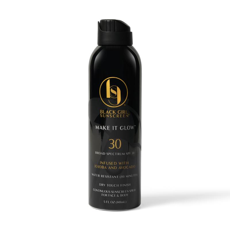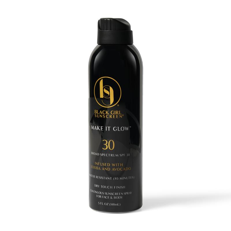 Discover the ultimate in sun protection with Black Girl Sunscreen Make It Glow. This lightweight, continuous sunscreen spray is designed to apply evenly to your body, leaving a layer of sun protection from harmful UVA/UVB rays.