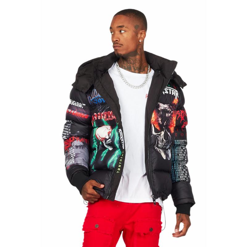An urban streetwear puffer jacket for men in black. Designed with highest-quality insulated fabric and water and wind-resistant materials for a must-cop outerwear style.