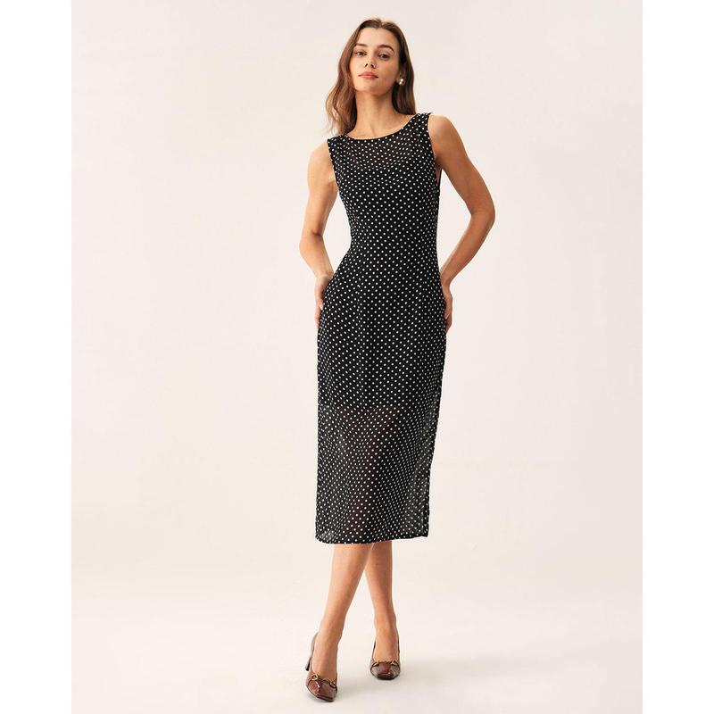 Black Polka Dot Boat Neck Midi Dress