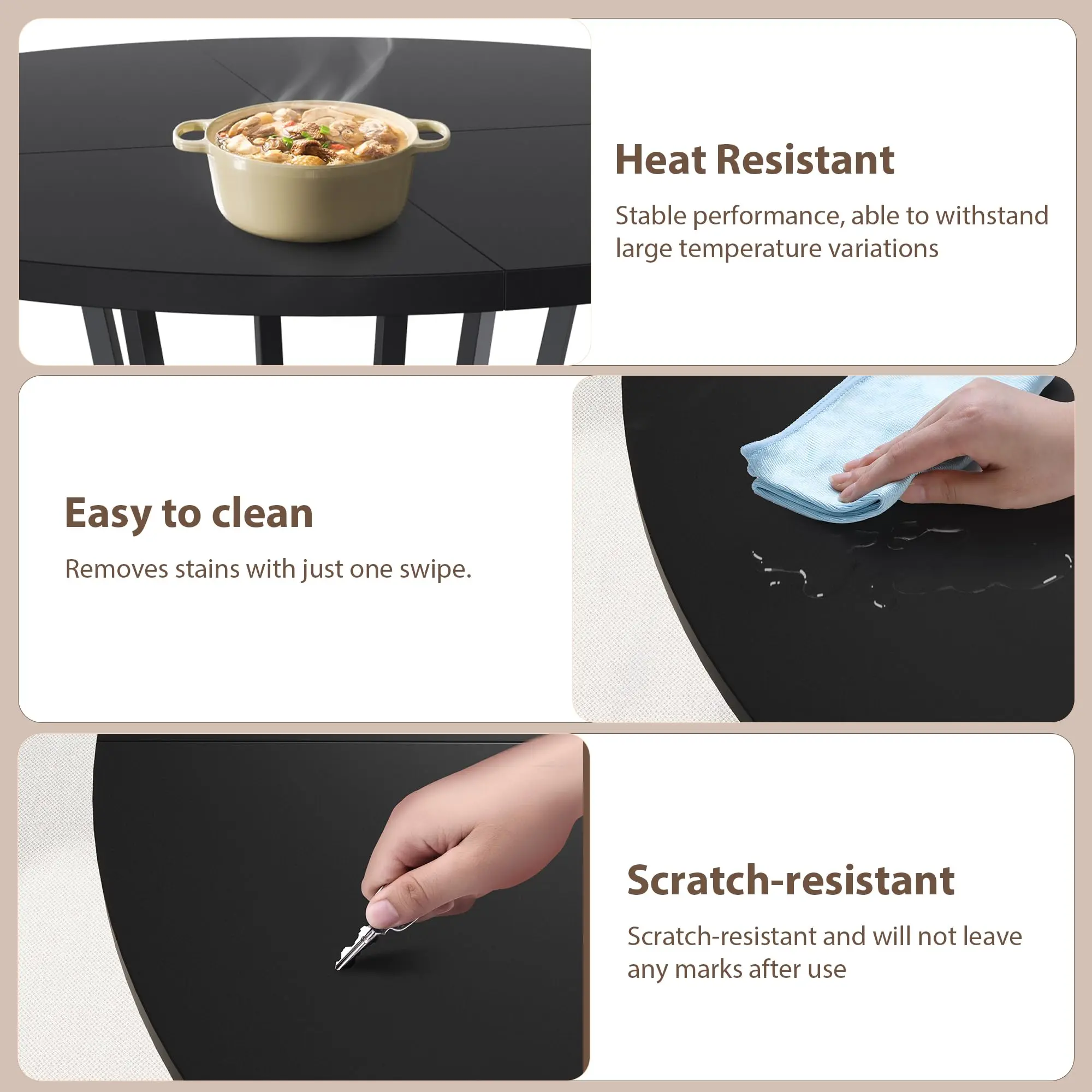 【Ideal for families of 4-6】 (Package includes 1 table) This 47 in round dining table brings generous space to both kitchens and dining rooms, comfortably accommodating 4 to 6 people. Whether it’s cozy family dinners or vibrant get-togethers with friends, it stands as the perfect centerpiece to anchor every memorable gathering.