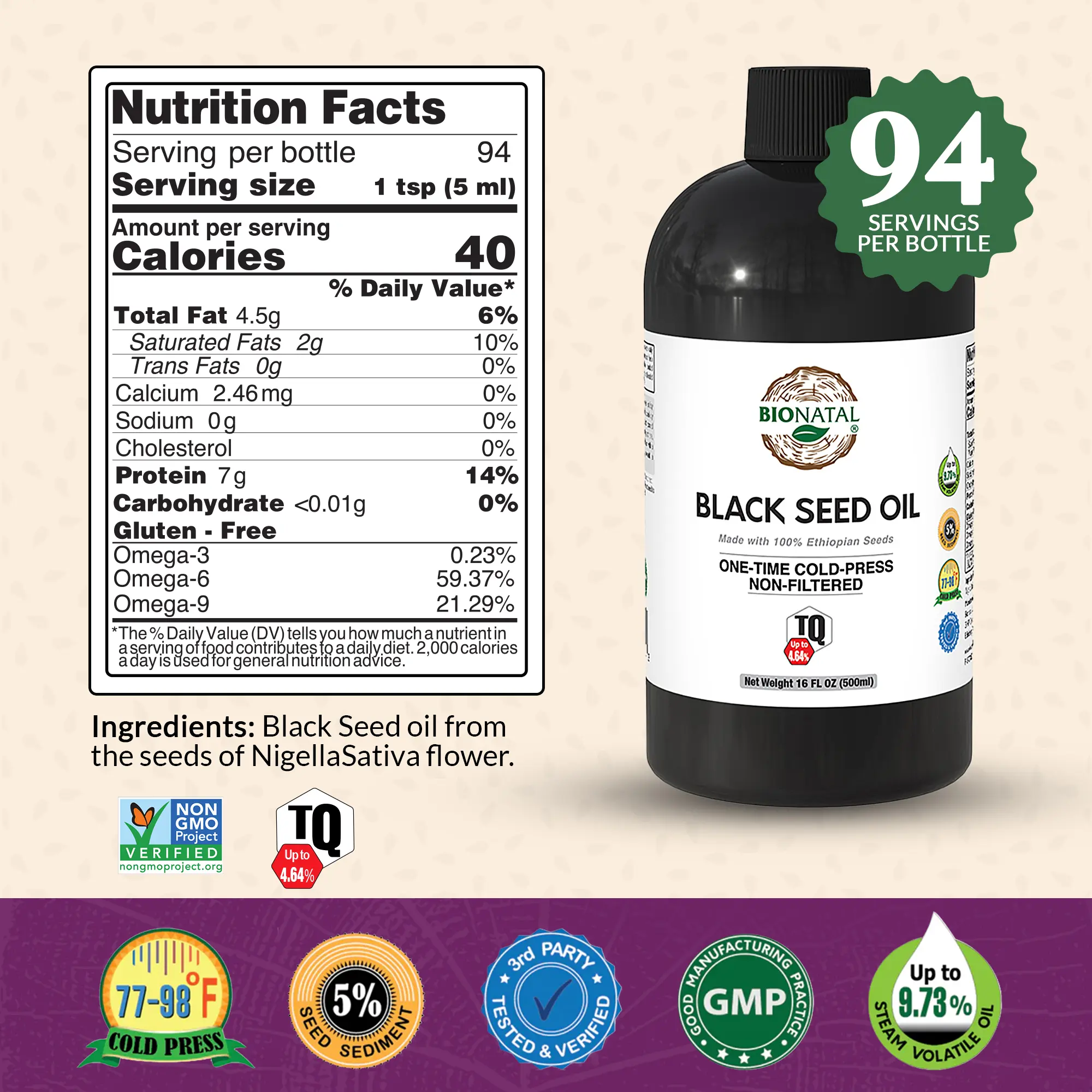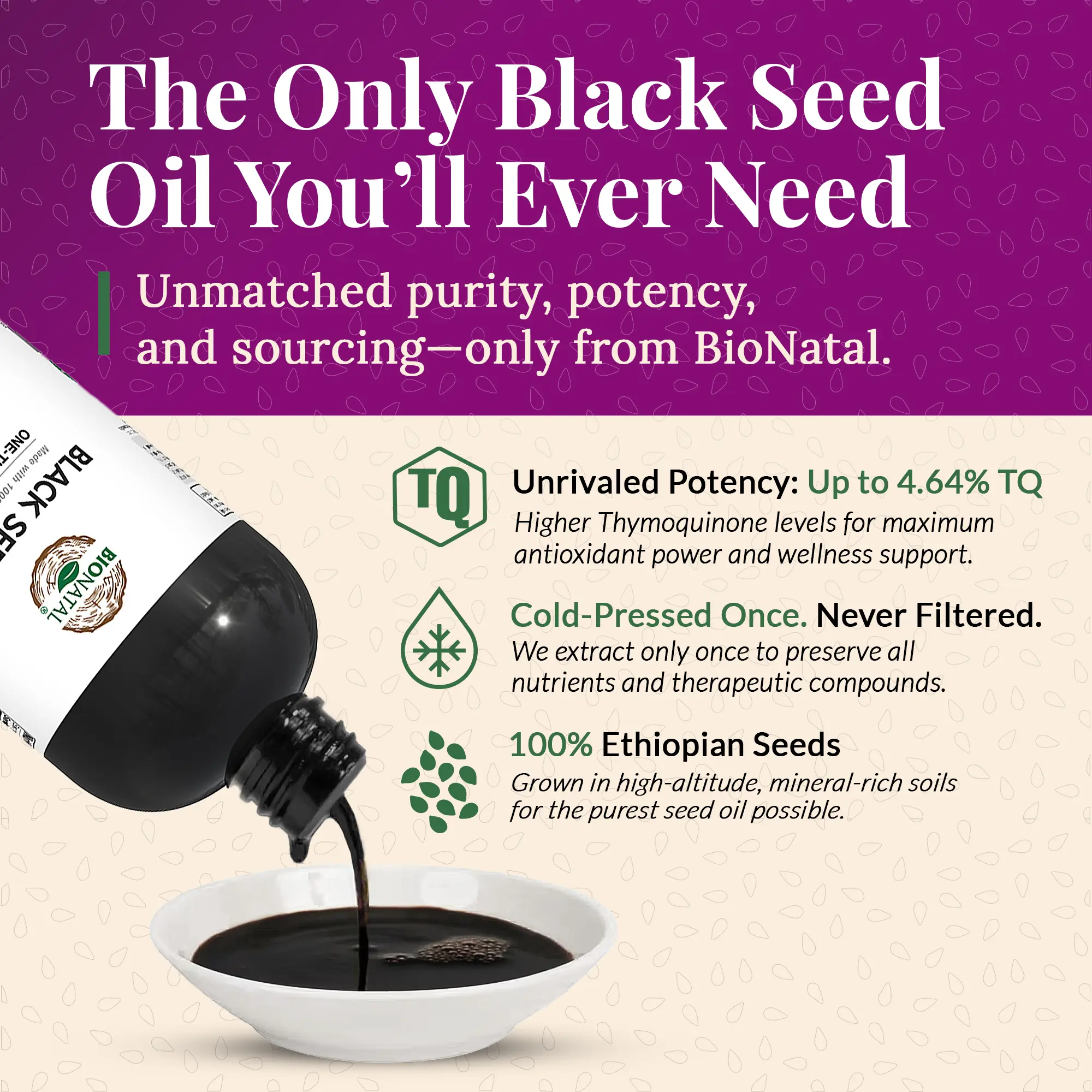 BioNatal uses only naturally grown, non-GMO Nigella sativa seeds harvested within the last 12 months. The oil is cold-pressed at low temperatures (77–98°F) without chemicals, solvents, filtering, or blending. Each batch is third-party tested for Thymoquinone (TQ), with levels verified up to 4.64%, reflecting exceptional natural potency.