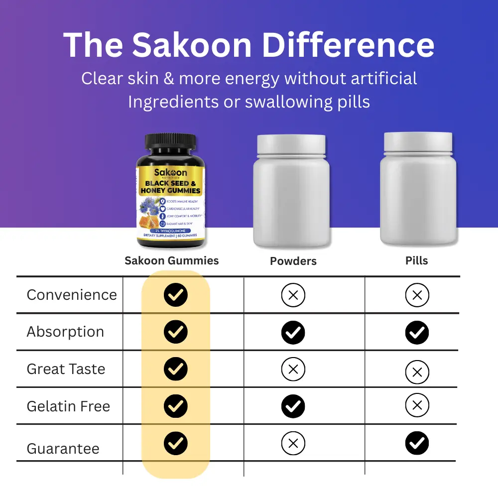 #BlackSeedOil #HoneyGummies #ImmuneSupport #HairSkinHealth #NaturalSupplements #DailyWellness #VeganSupplements #HealthyLifestyle #SakoonNutrition