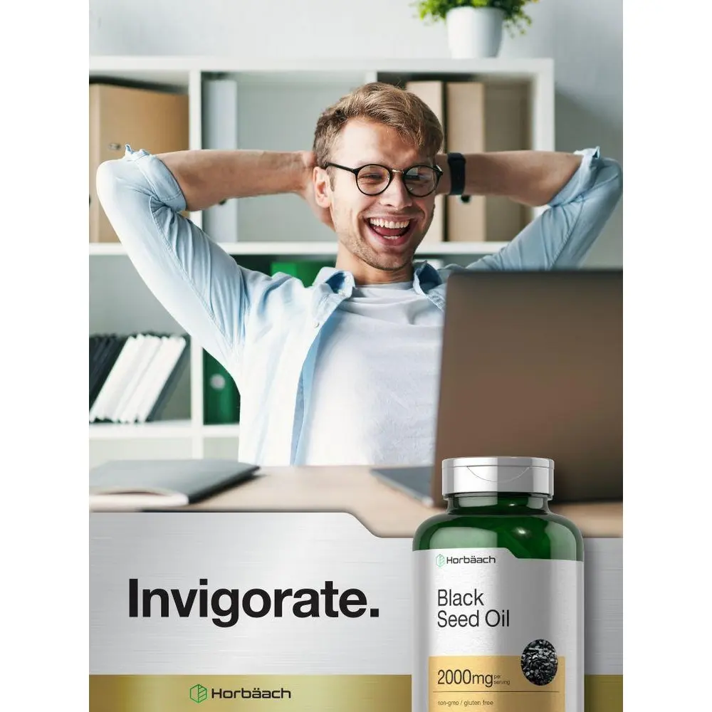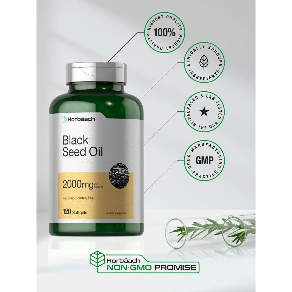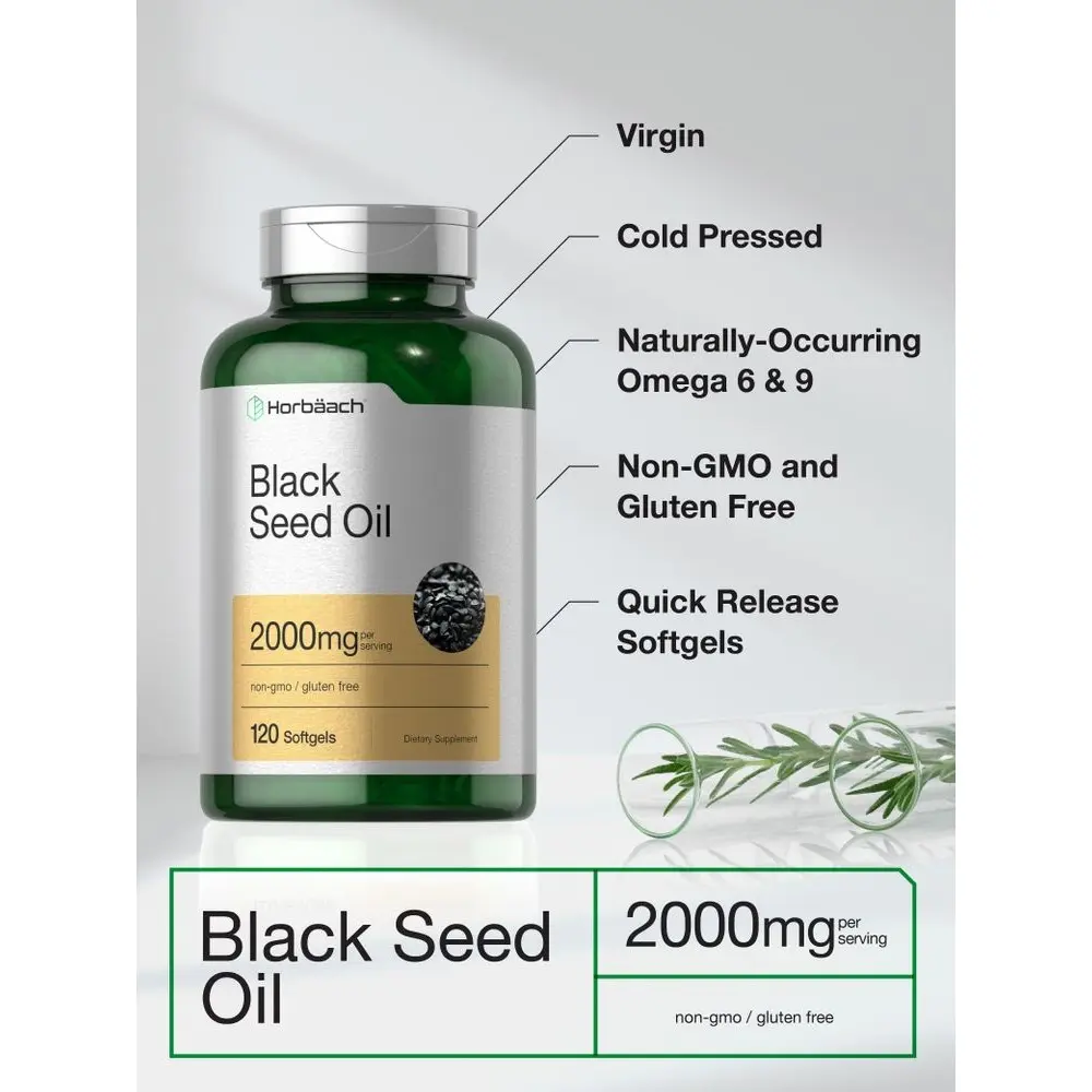 Discover the power of this little seed with Horbaach Black Seed Oil! This high-quality supplement provides 2,000 mg per serving of Black Cumin extract in quick-release softgels, packed with naturally occurring TQ and Omega 6 & 9 fatty acids. Our gluten-free, non-GMO formula is quality tested to ensure maximum purity and potency, making it the top choice for any nutrition plan. WARNING: If you are pregnant, nursing, taking any medications or have any medical condition, consult your doctor before use. If any adverse reactions occur, immediately stop using this product and consult your doctor. If seal under cap is damaged or missing, do not use. Keep out of reach of children. Store unopened container in a cool, dry place. Keep away from heat or direct sunlight.