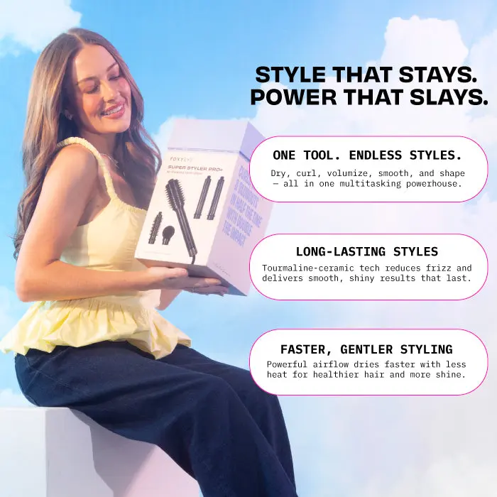 Meet the Super Styler Pro+ — your upgraded 5-in-1 multitasker that dries, curls, volumizes, smooths, and slays — all with less damage and way more staying power. Now sleeker and slimmer (hello shimmer), this styling powerhouse features salon-strength airflow, a continuous cool shot, and longer ceramic-coated auto-wrap barrels for even smoother, longer-lasting styles. Whether you’re going for a sleek, voluminous finish or full-glam bounce, it’s your all-in-one secret to styling smarter, not harder.