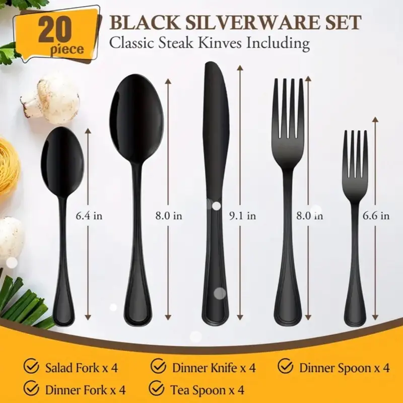 ·Design: The silverware set features a sleek black design.