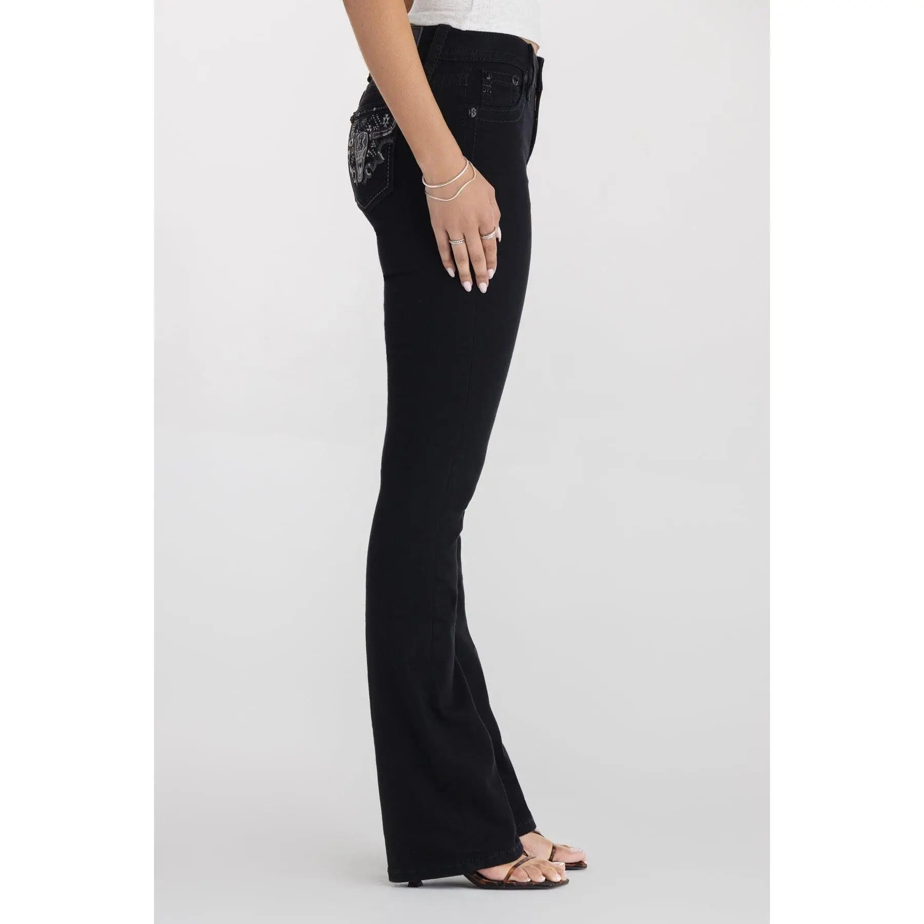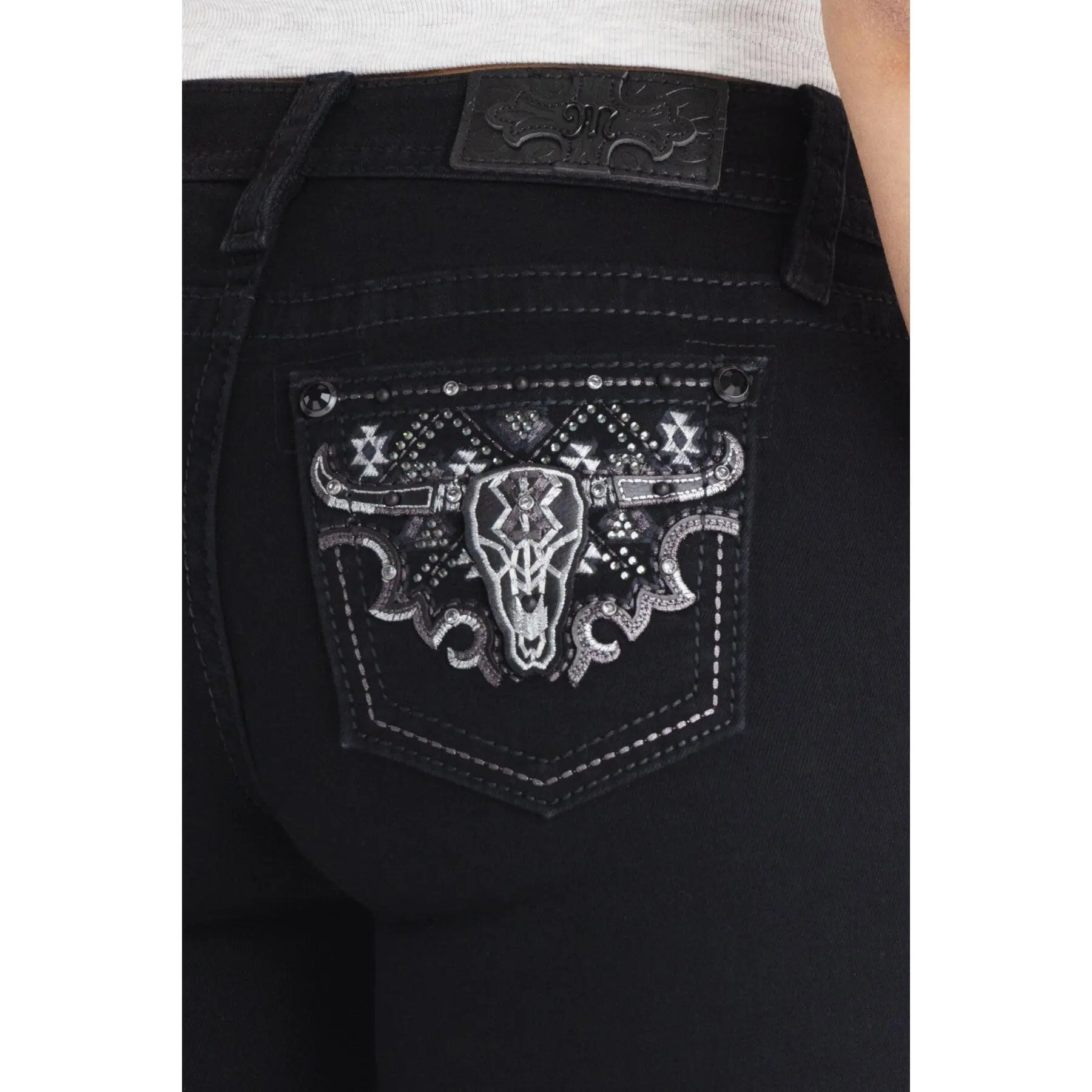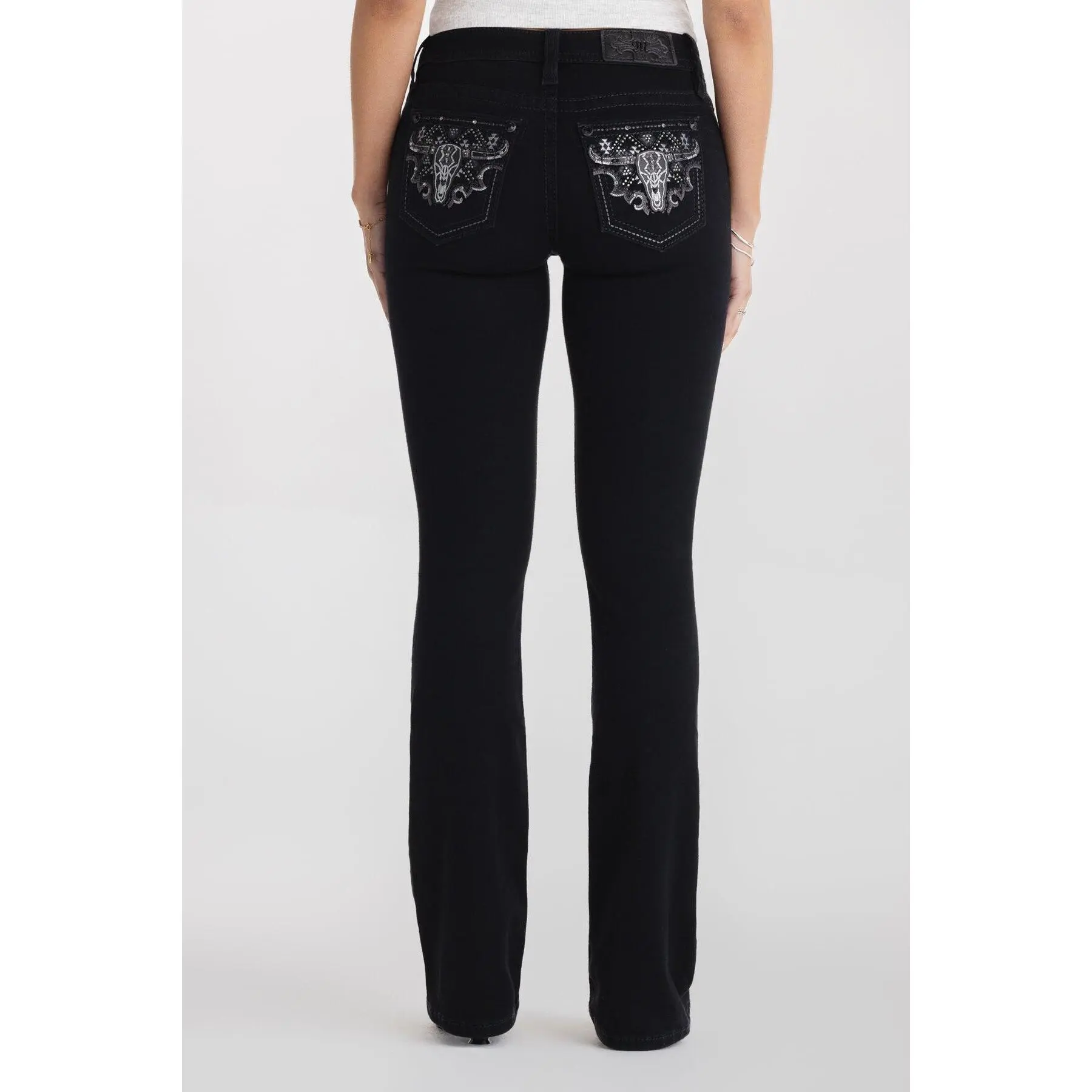 Mid-rise bootcut jeans- Embroidered leather appliqué longhorn design- Geometric stitching with rhinestone accents- Stud and rhinestone rivet detailing- Embossed black leather cross Miss Me brand patch- 5-pocket designModel is wearing size: 25Model Measurements:Height: 5’9”Bust: 34BWaist: 25”Hips: 36”Fabric Content: 70% Cotton, 20% Polyester, 8% Rayon, 2% ElastaneCare: Gentle machine wash inside-out with like colors in cold water. Tumble dry low.Style No. M9553BL-B01, M9553BS-B01, M9553BV-B01