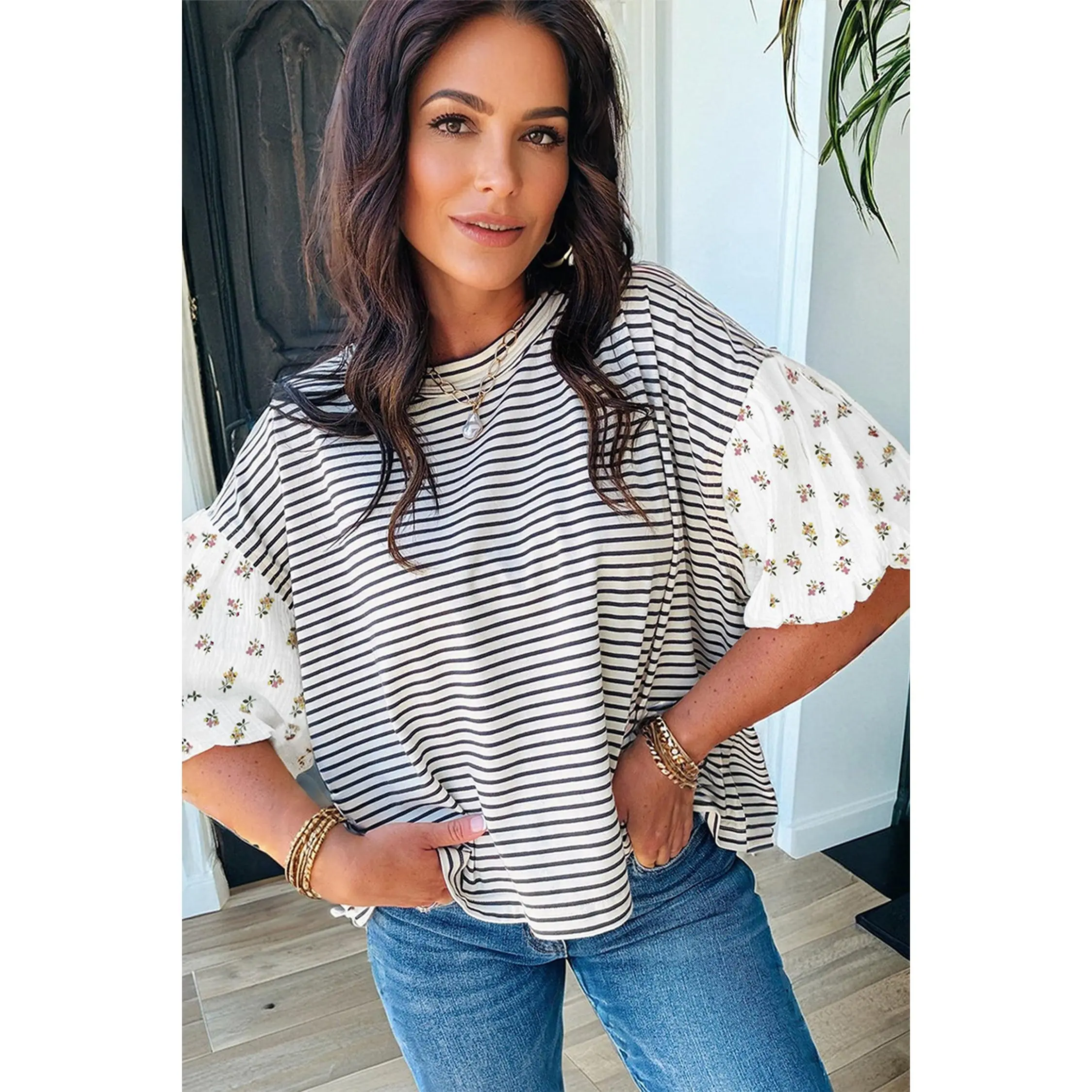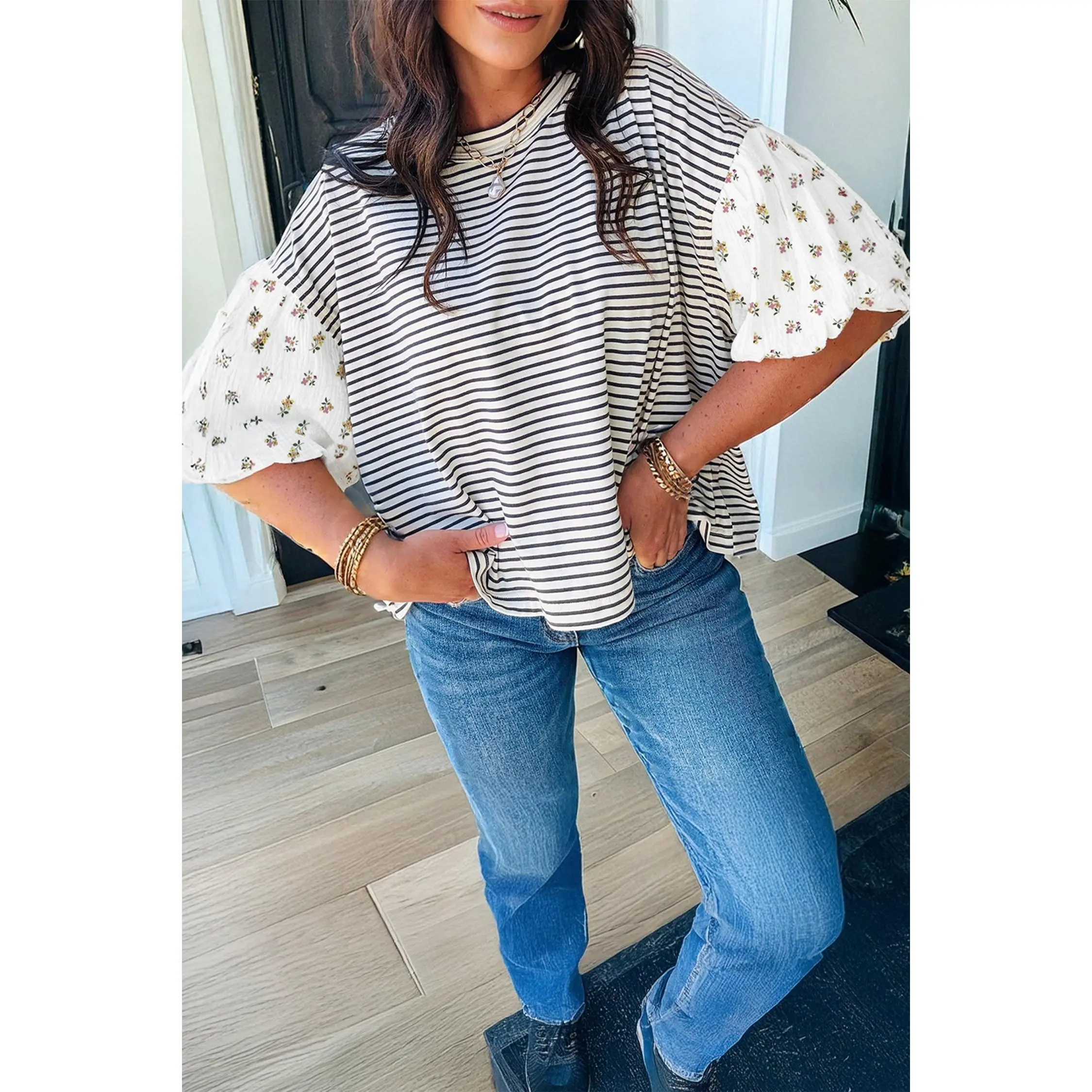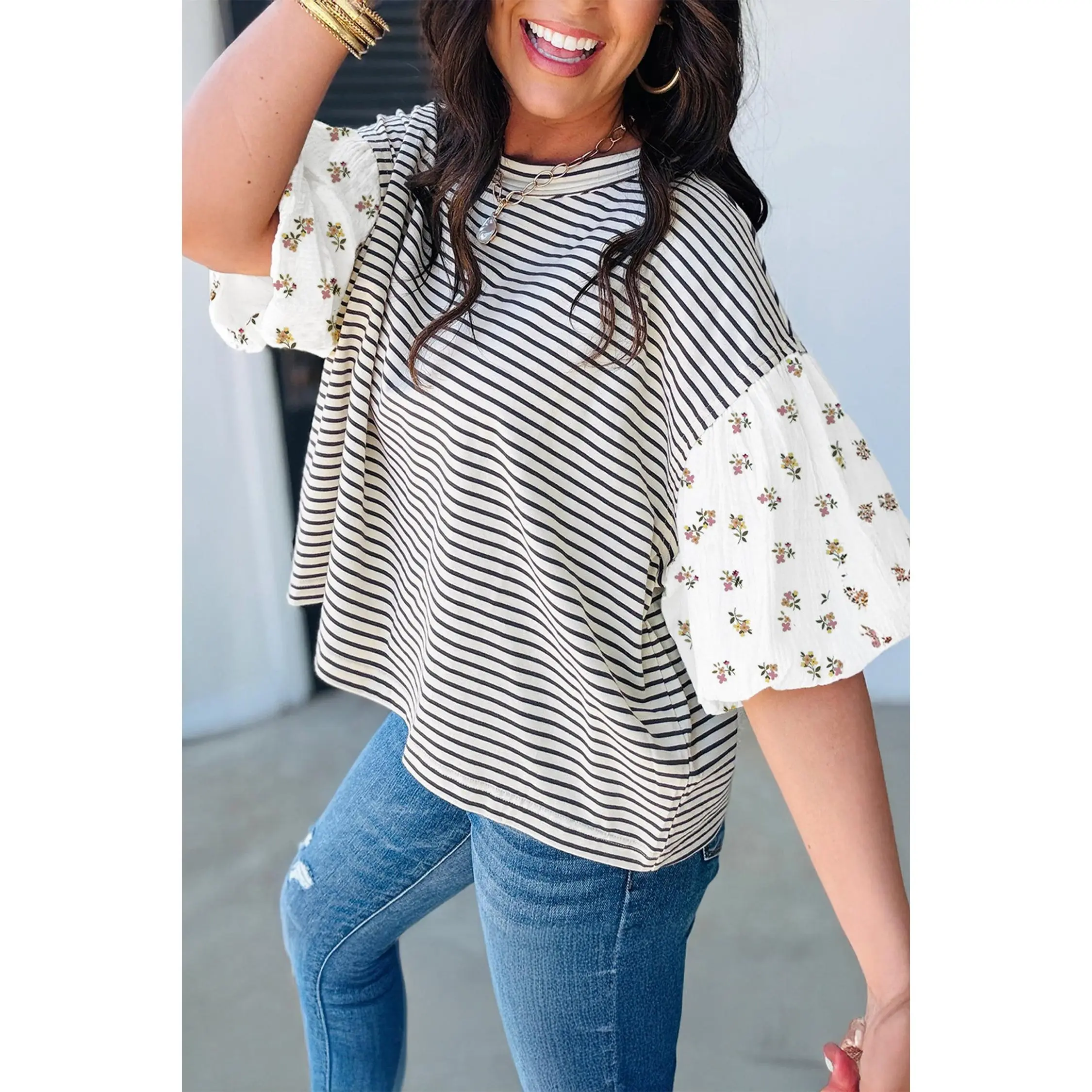 5. Black Stripe Floral Puff Sleeve Patchwork Round Neck Loose Top