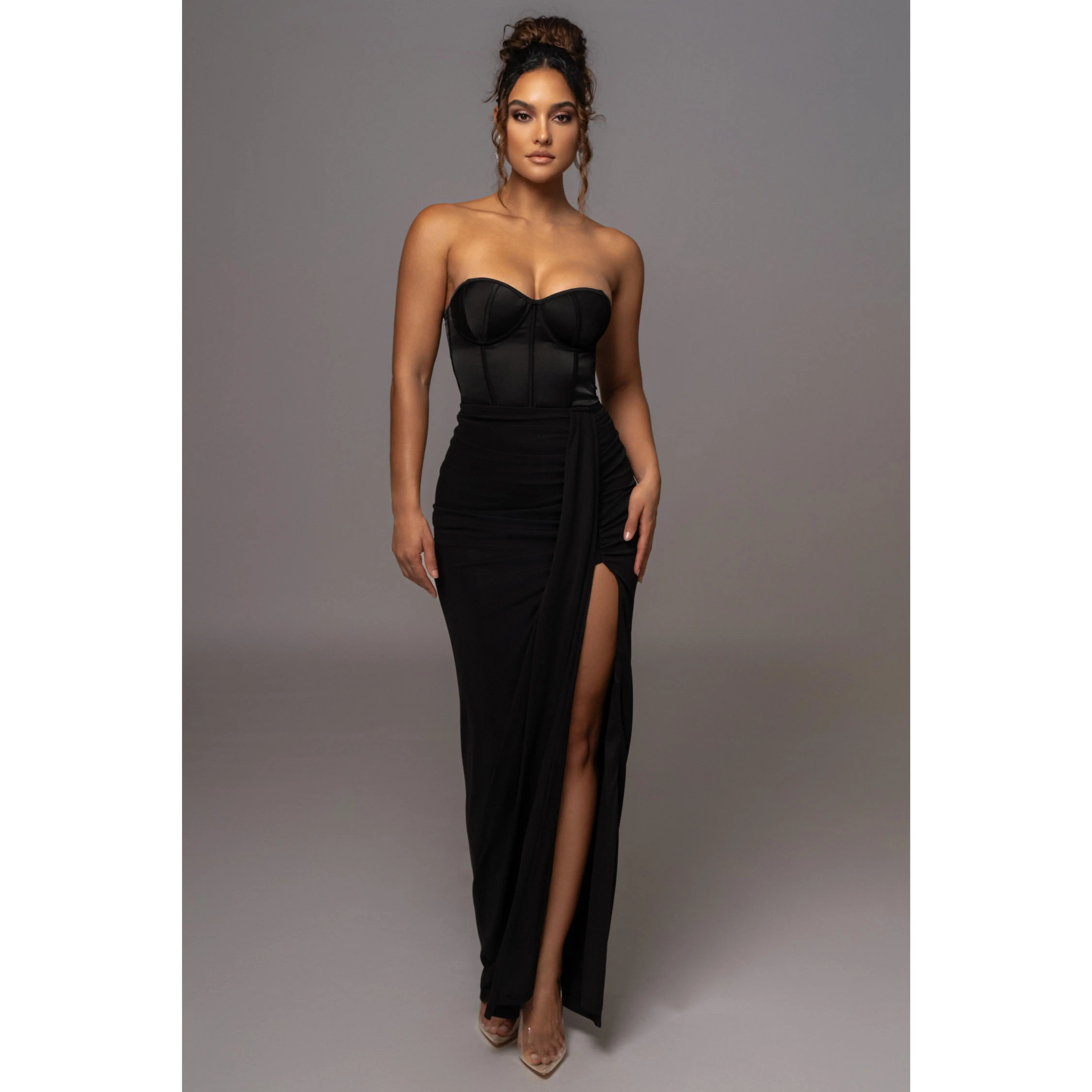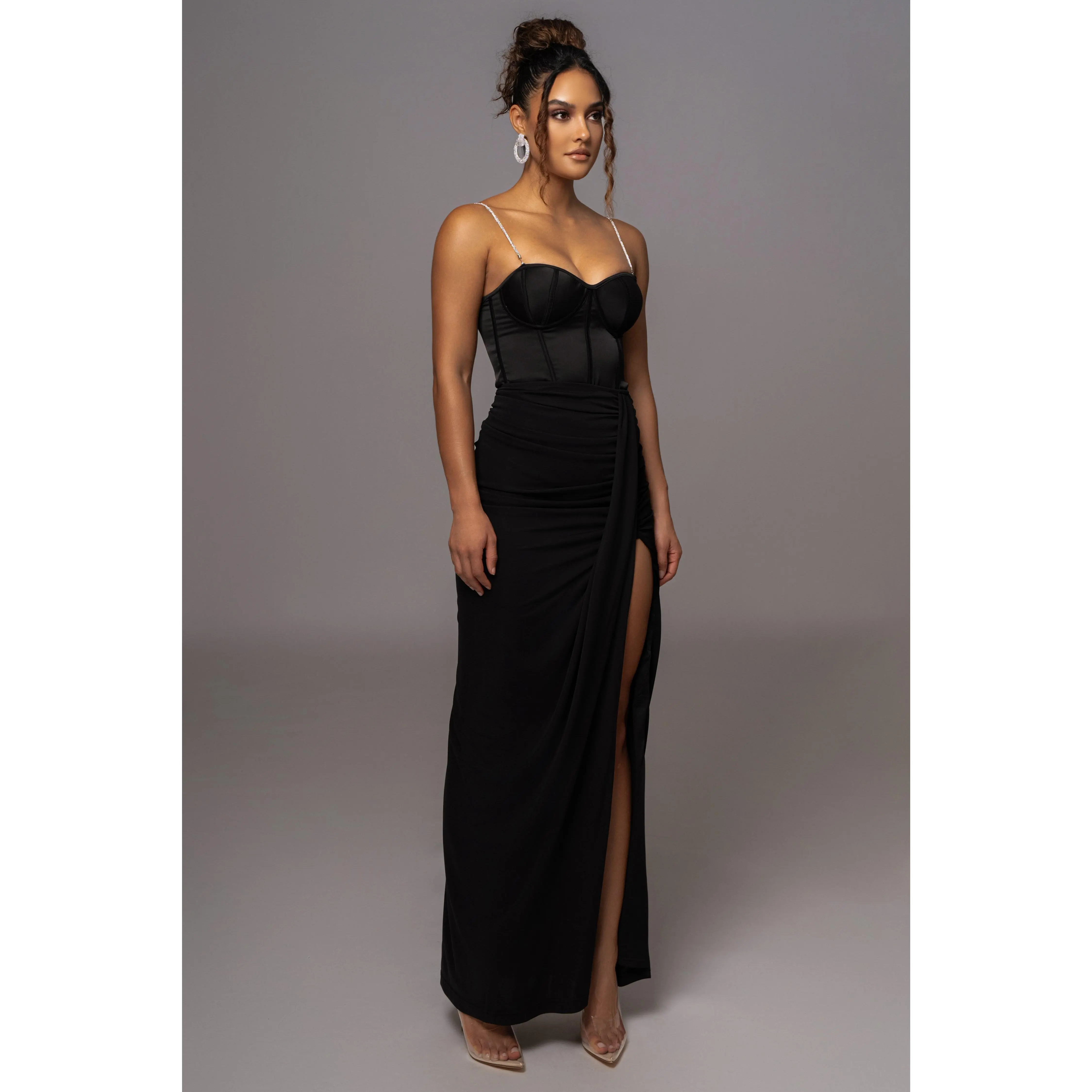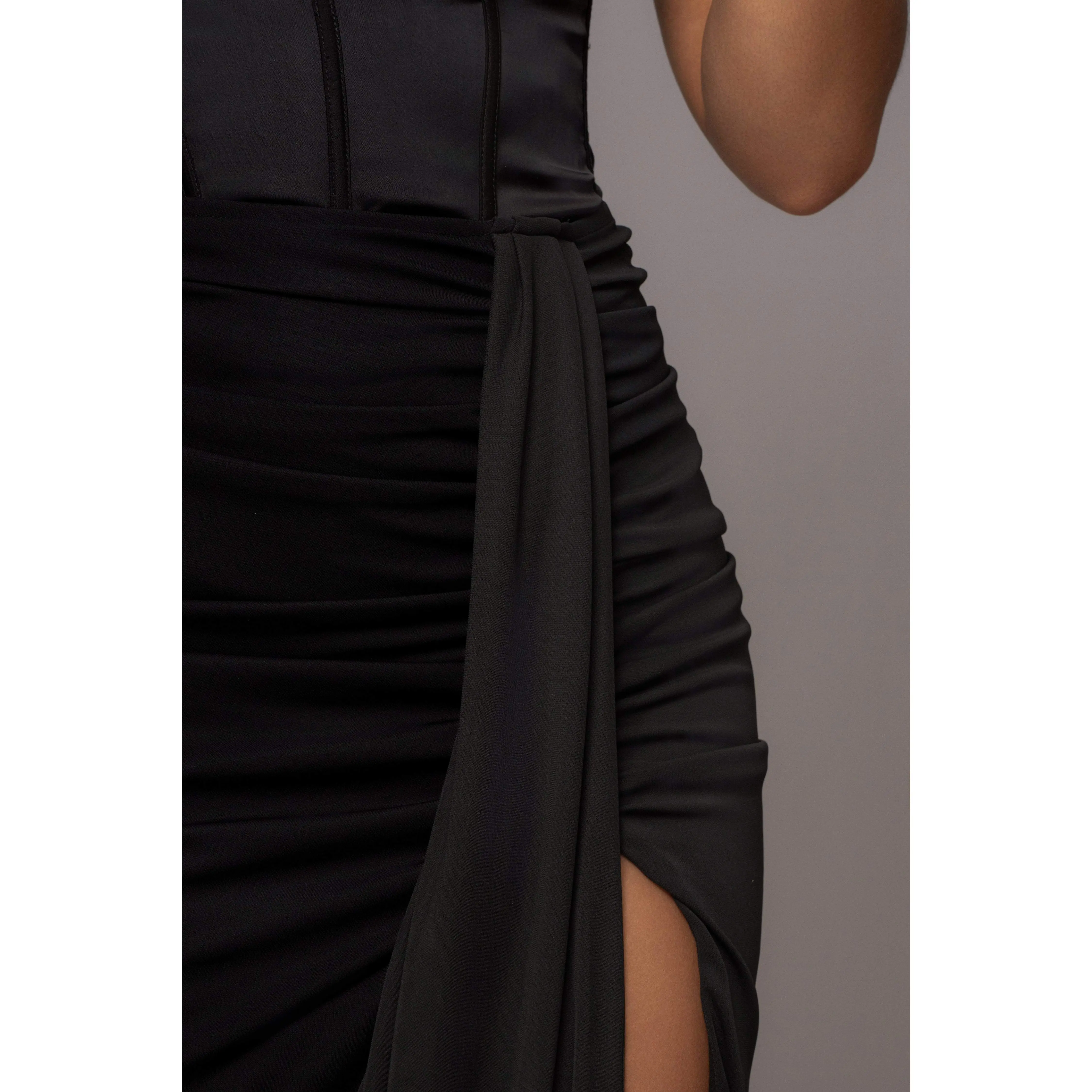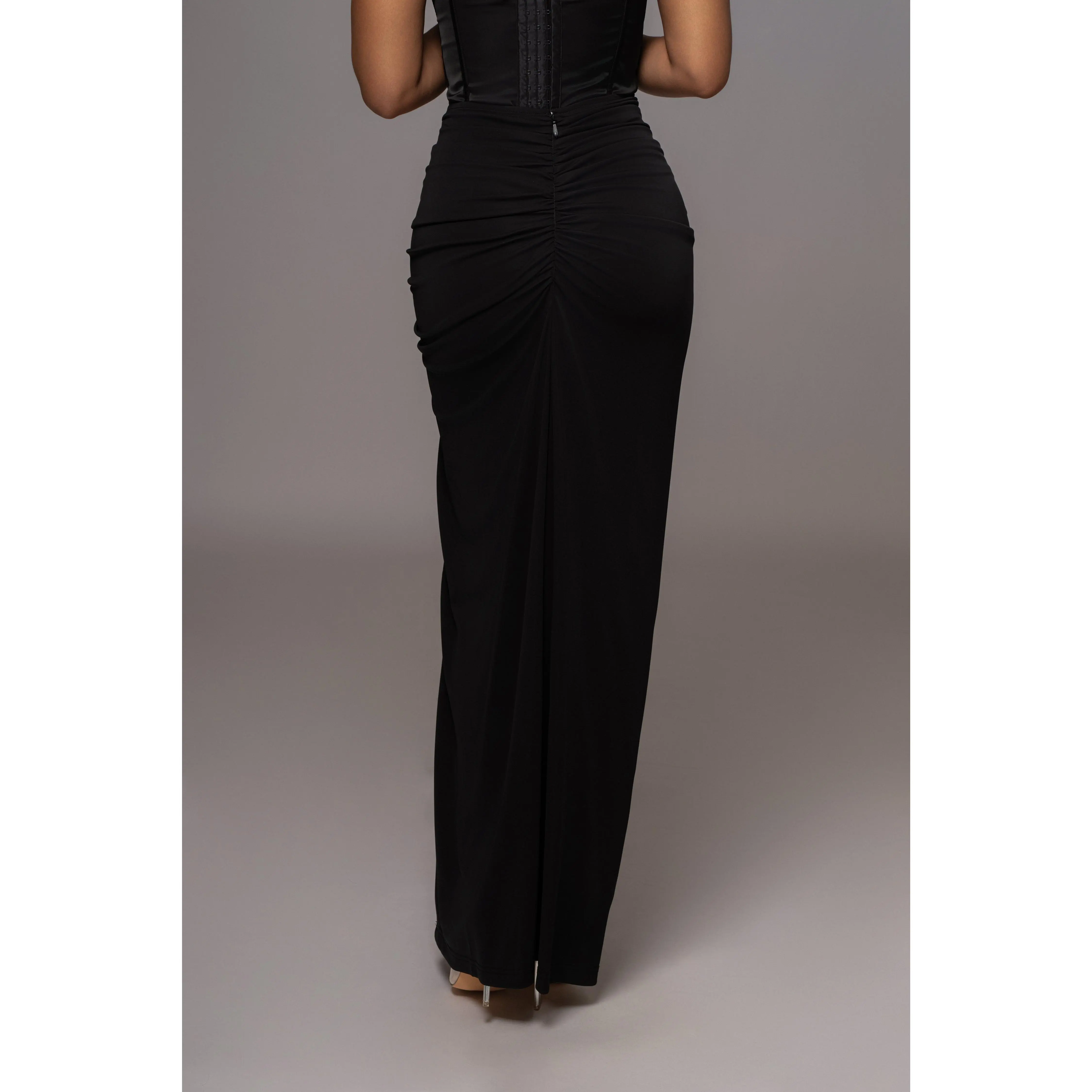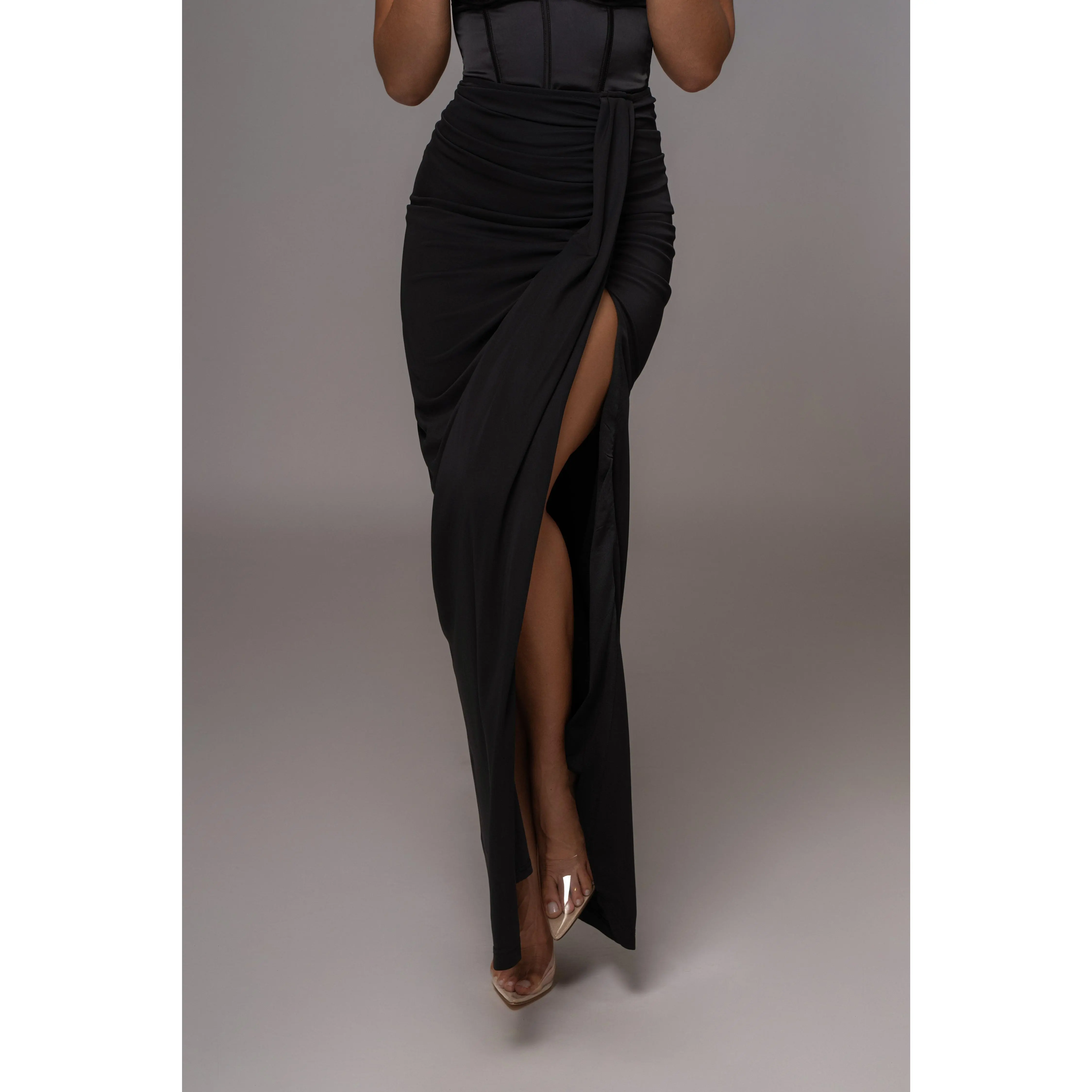 Take glamour to the next level with our Black Tara Drape Skirt! Featuring a draped design with a maxi silhouette that makes a stunning statement, this piece is enhanced by a thigh slit and subtle ruching. Hidden back zipper closure. Double lined. Stretchy.
