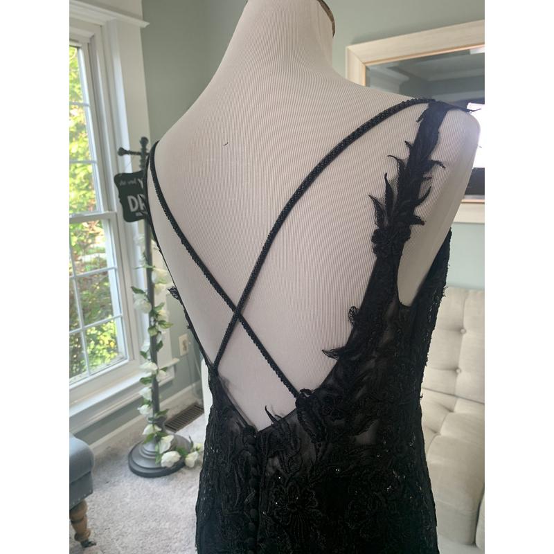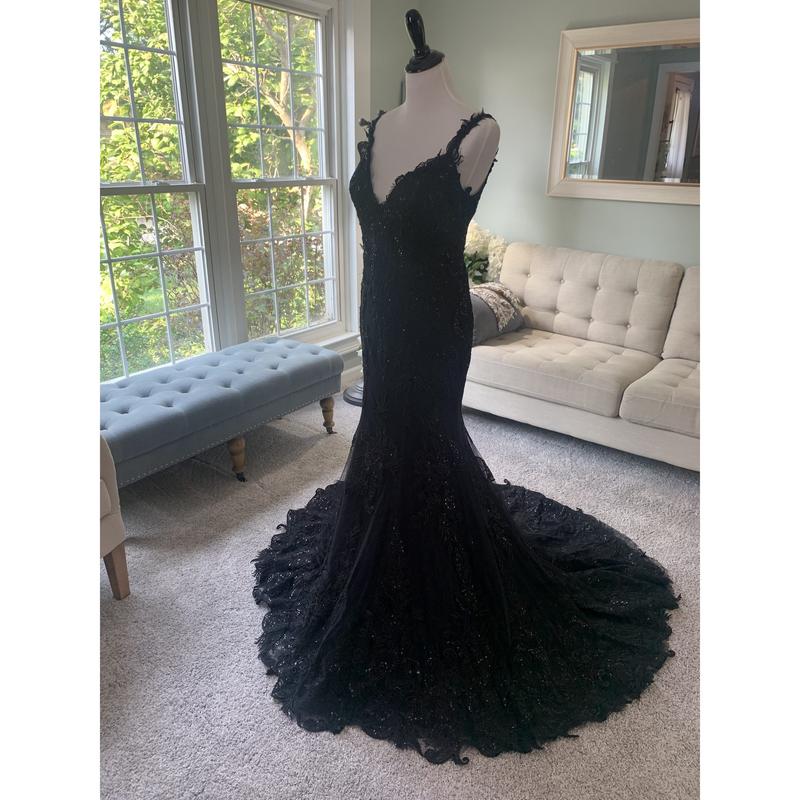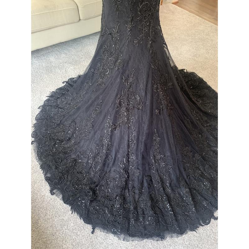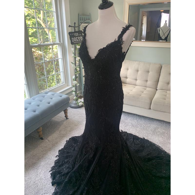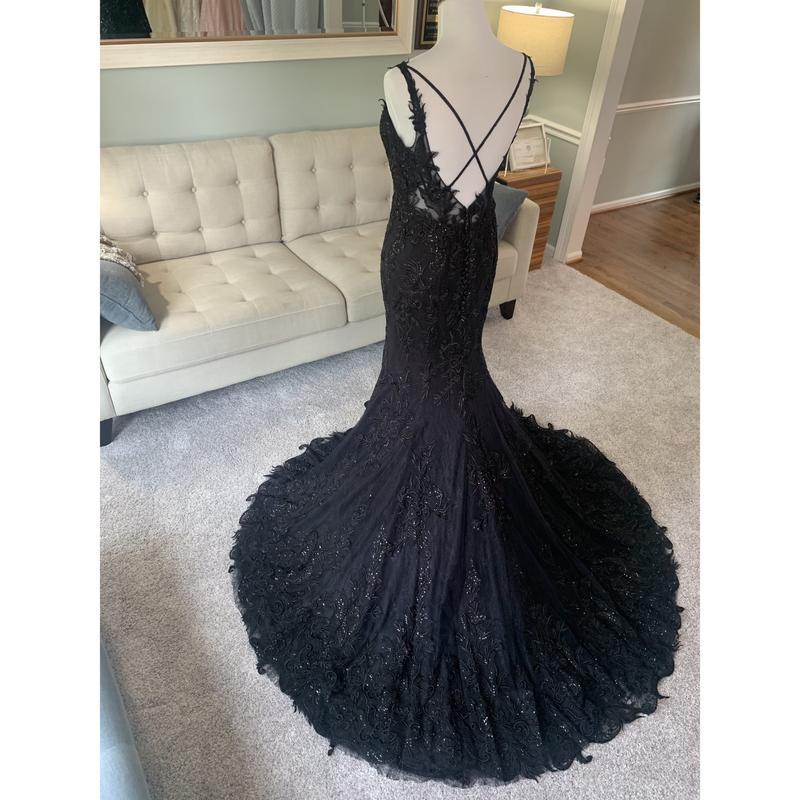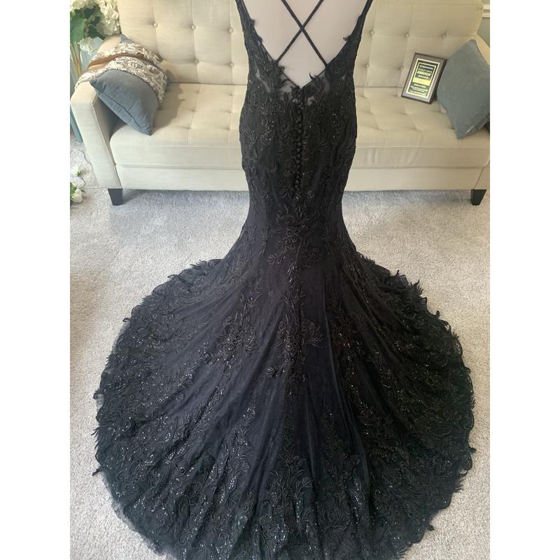 Our Talia A-Line Custom Black Wedding Dress with V neckline includes a gorgeous V neckline, beautiful floral delicate black lace and layer of chantilly lace below the outer layer for adding beautiful dimension. The lace also includes sequins for adding a subtle yet elegant sparkly effect to the dress. It has a beaded X shape at the back making it super elegant and unique.