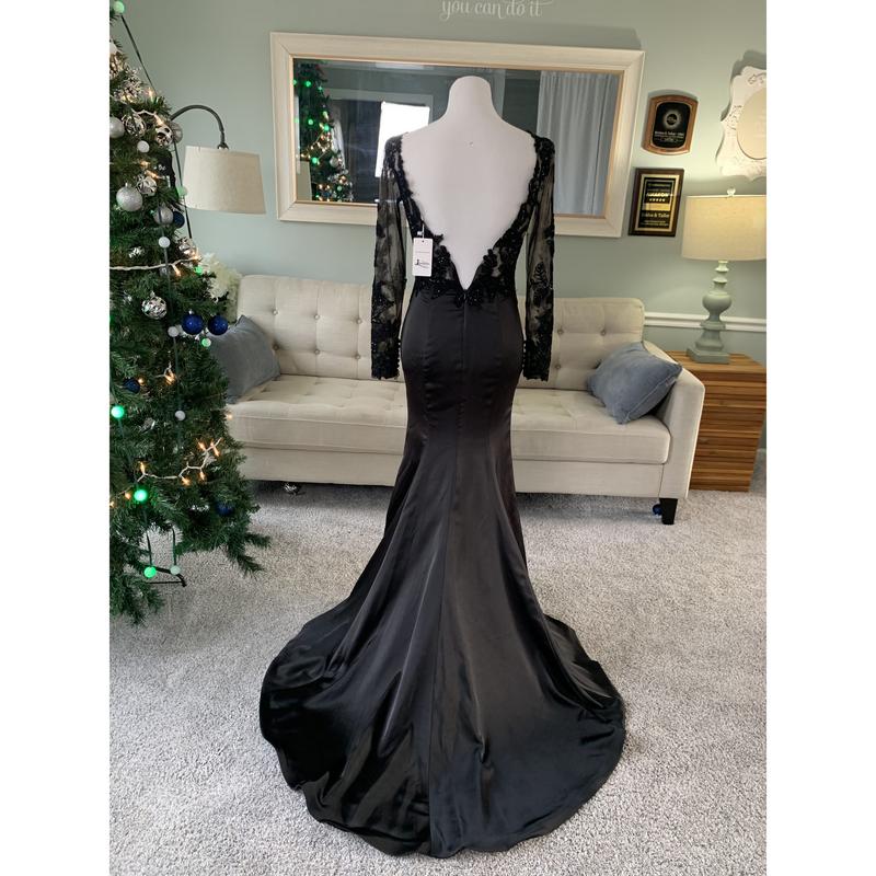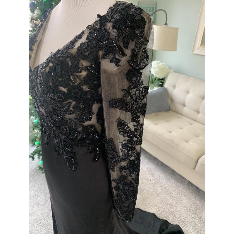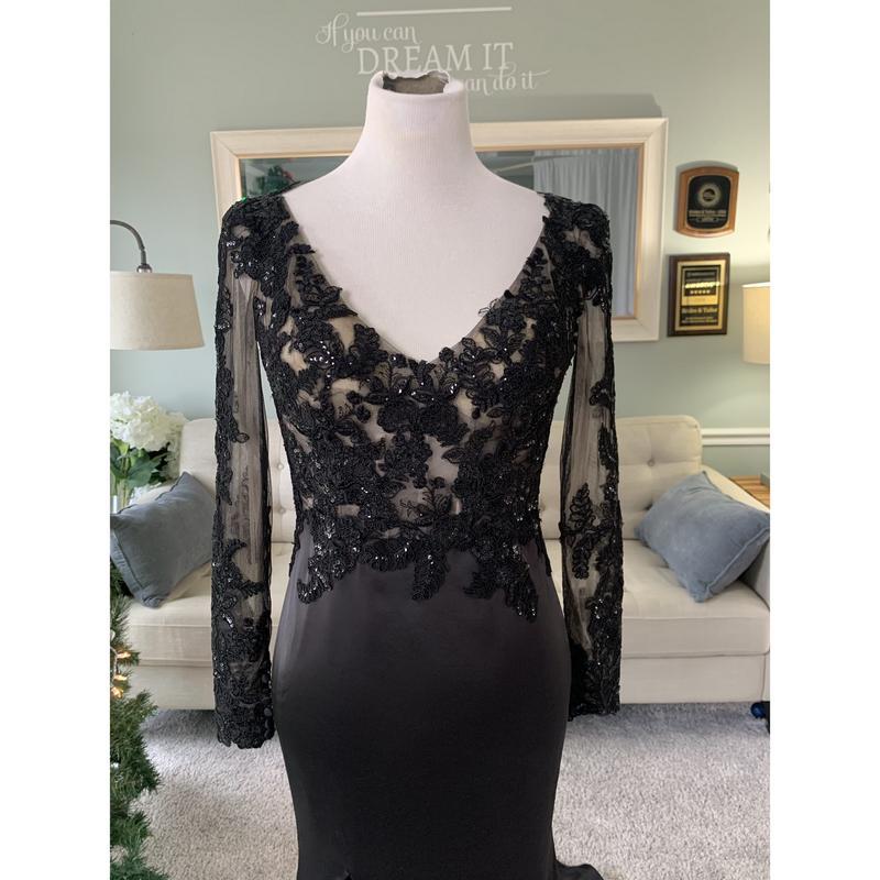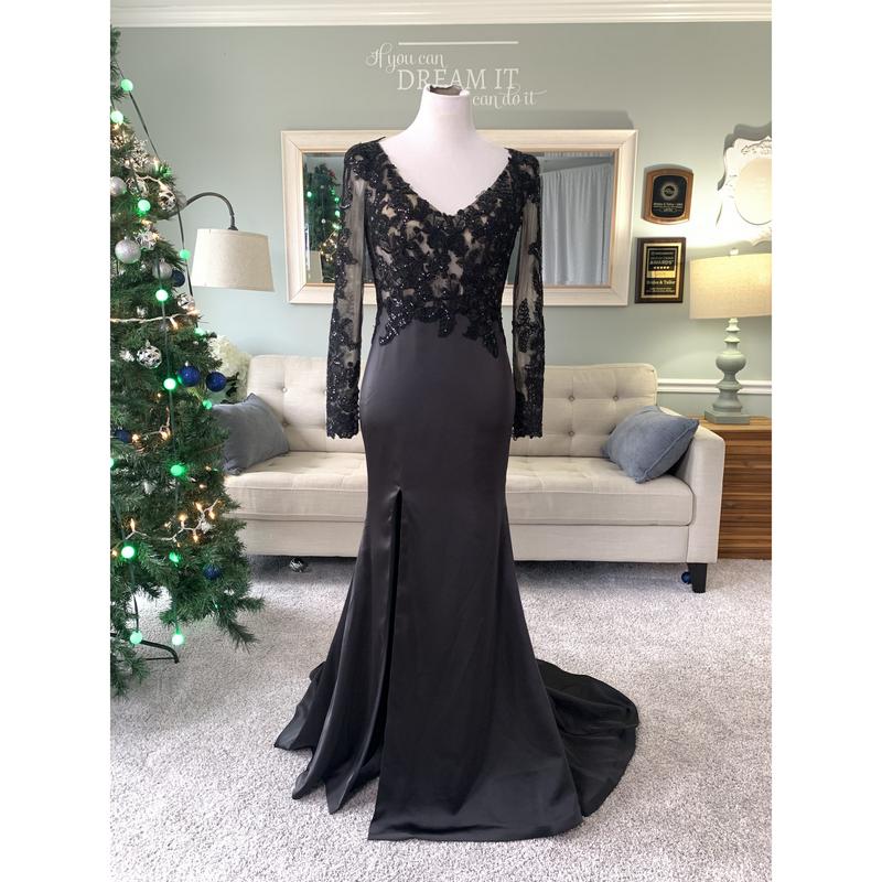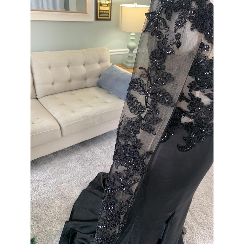 If you've been looking for the perfect black wedding dress with a slit, you've hit the jackpot!:) This gorgeous custom black wedding dress will definitely be the center of attention. It has a slit for a sexy silhouette, a see through bodice and beautiful floral lace applique for a royal bridal look. The deep V neckline at the back is also a key feature of this dress.