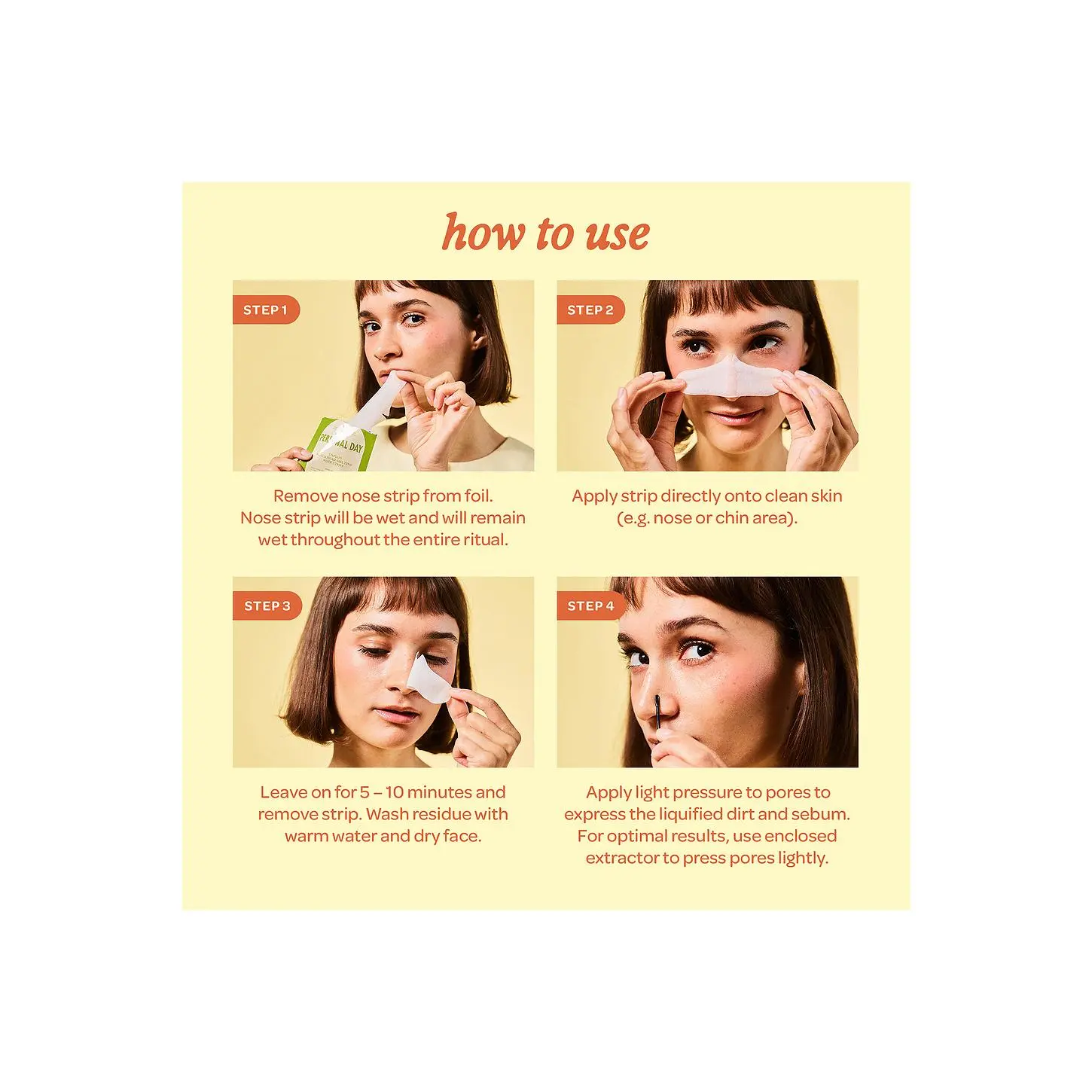 ·Just apply the wet strip to your nose for 5-10 minutes, remove, then apply light pressure to gently remove the liquefied gunk from your skin, leaving your pores clean and undamaged.