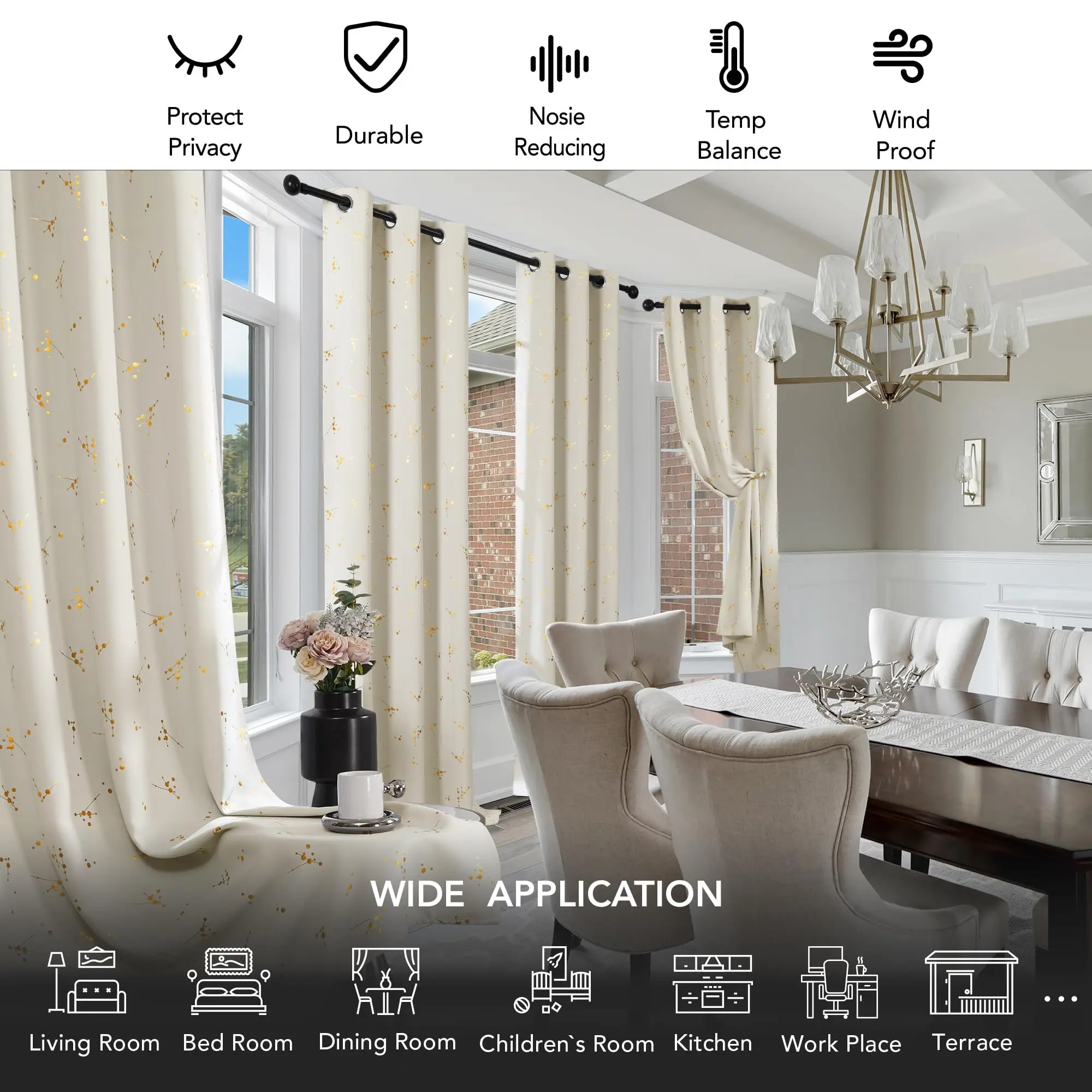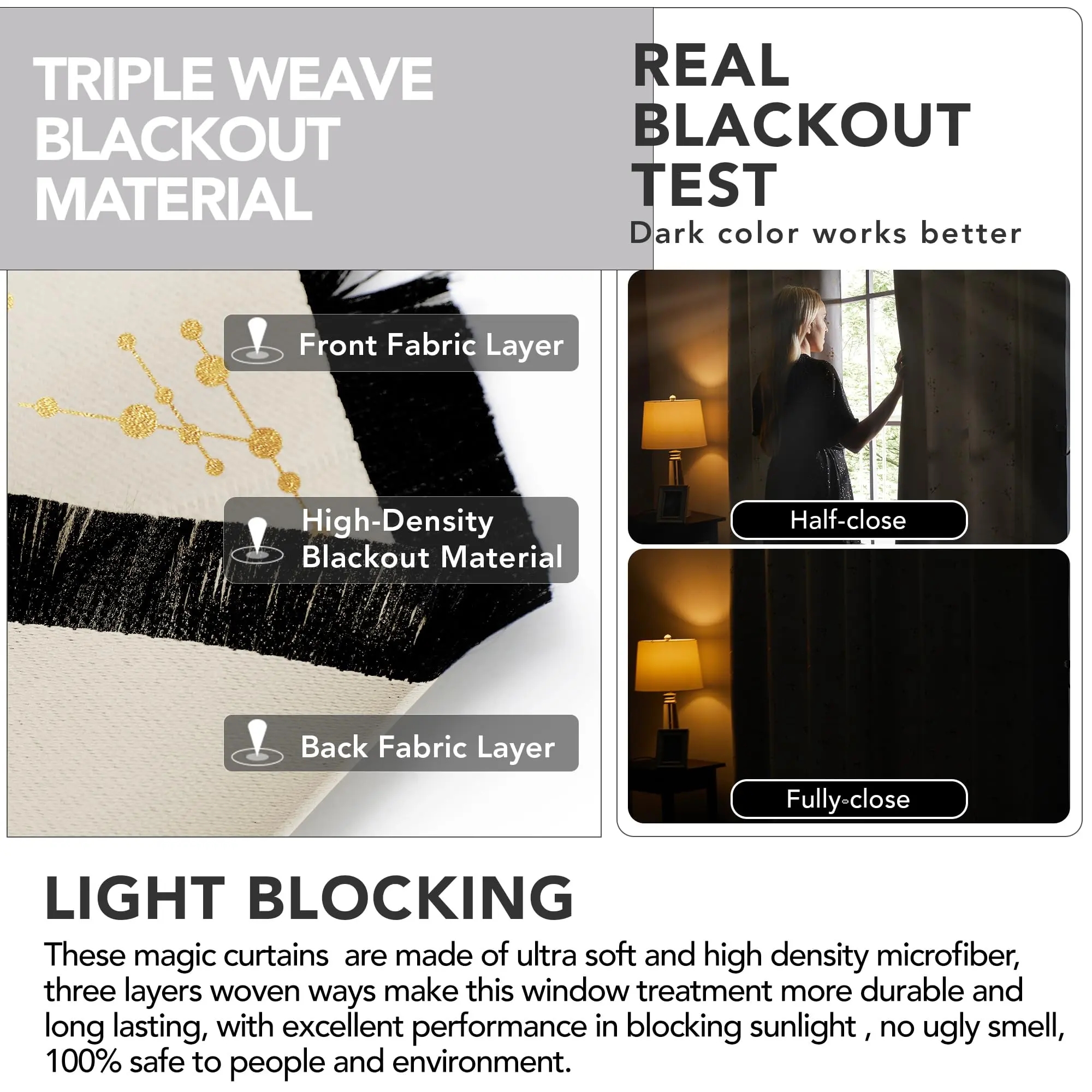 ·Light Blocking: Made of 100-percent polyester blackout fabric, these curtains are designed to considerably darken any room, giving you the ultimate privacy and reducing outside noise for an undisturbed sleep.