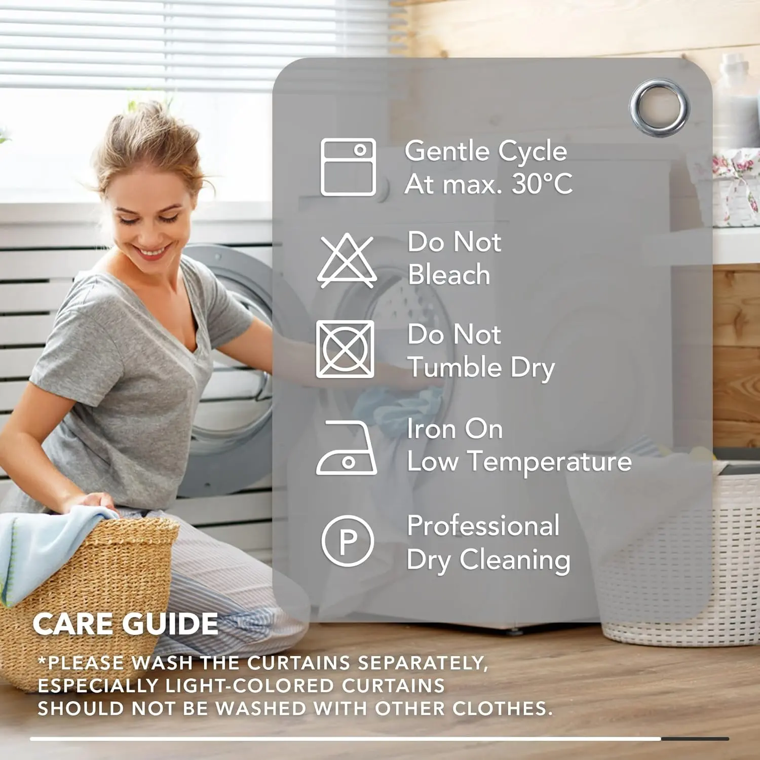·CARE INSTRUCTIONS - Designed for the everyday busy home owners with a smooth fabric for effortless hanging. For convenience, these curtains are machine washable. Wash below 86°F on gentle cycle. Do not bleach or tumble dry, low iron.