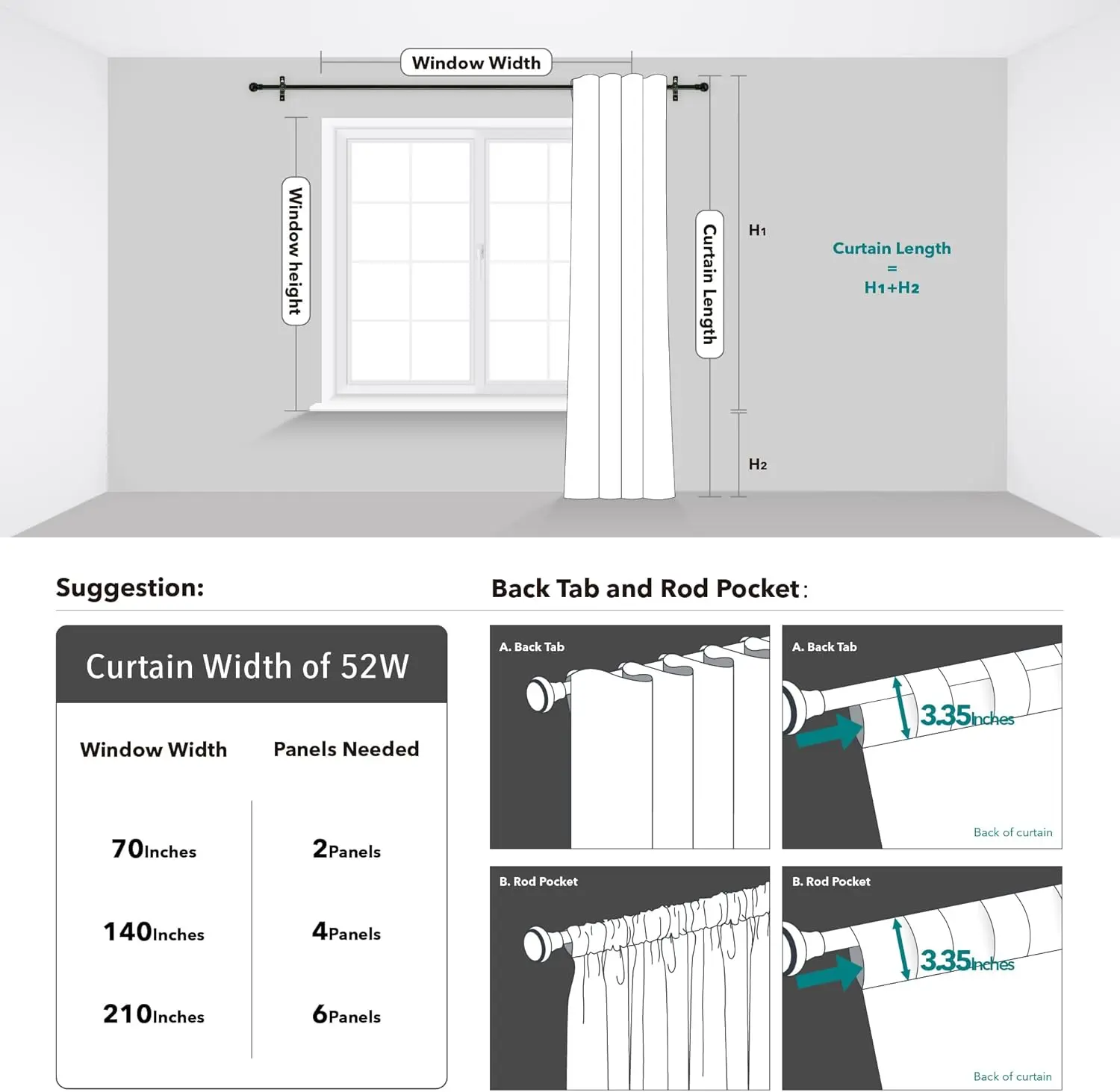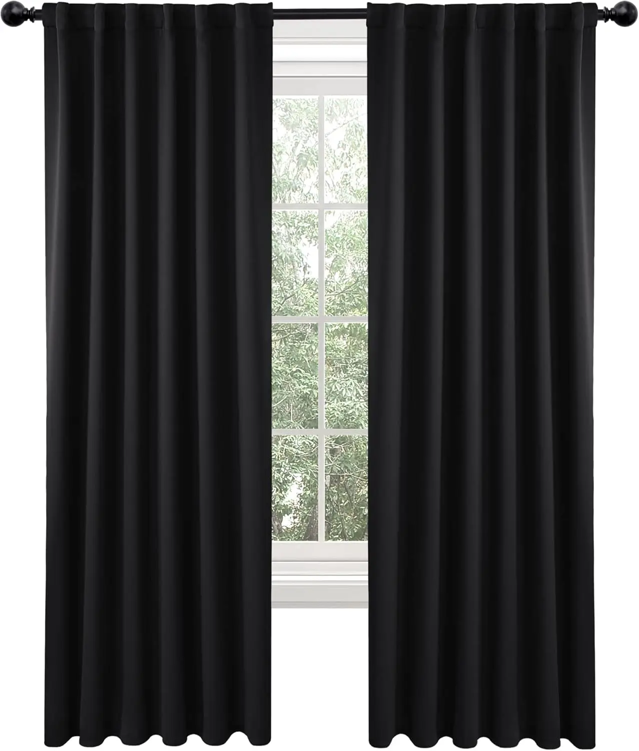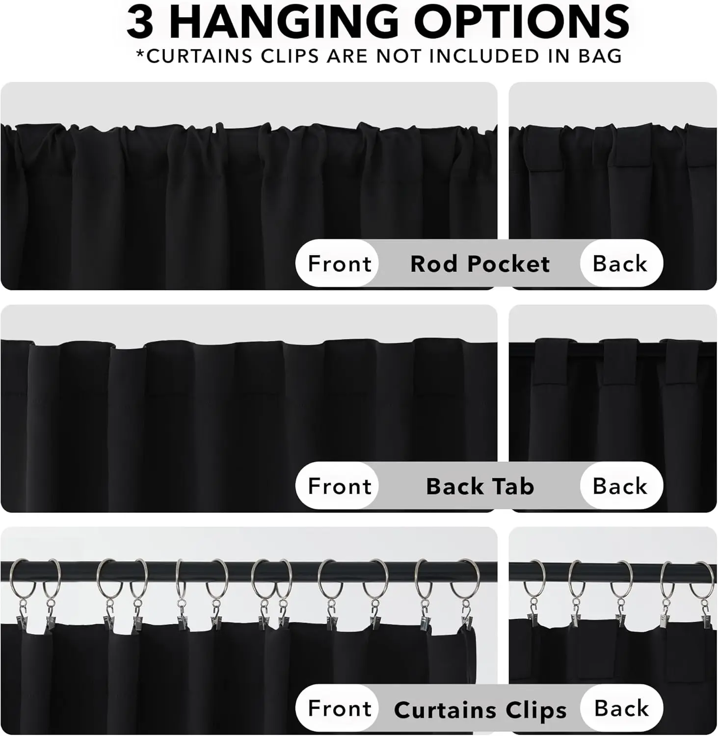 ·DESIGN and TEXTURE - This solid color blackout curtain features a smooth and elegant fabric with a silky touch and a beautiful drape that bring charm and modernity to your interior. Also these black out curtains can suitable for most decoration styles. There are 3 hanging styles to choose from: back loops(back tab), rod pocket or with your own clip-rings.