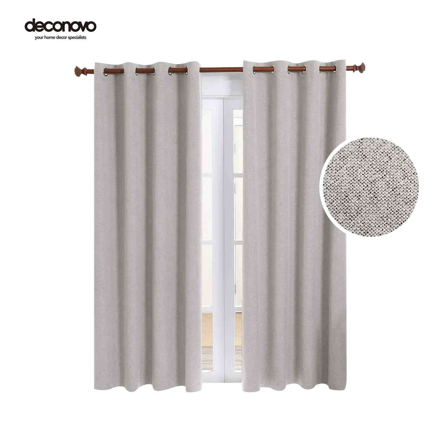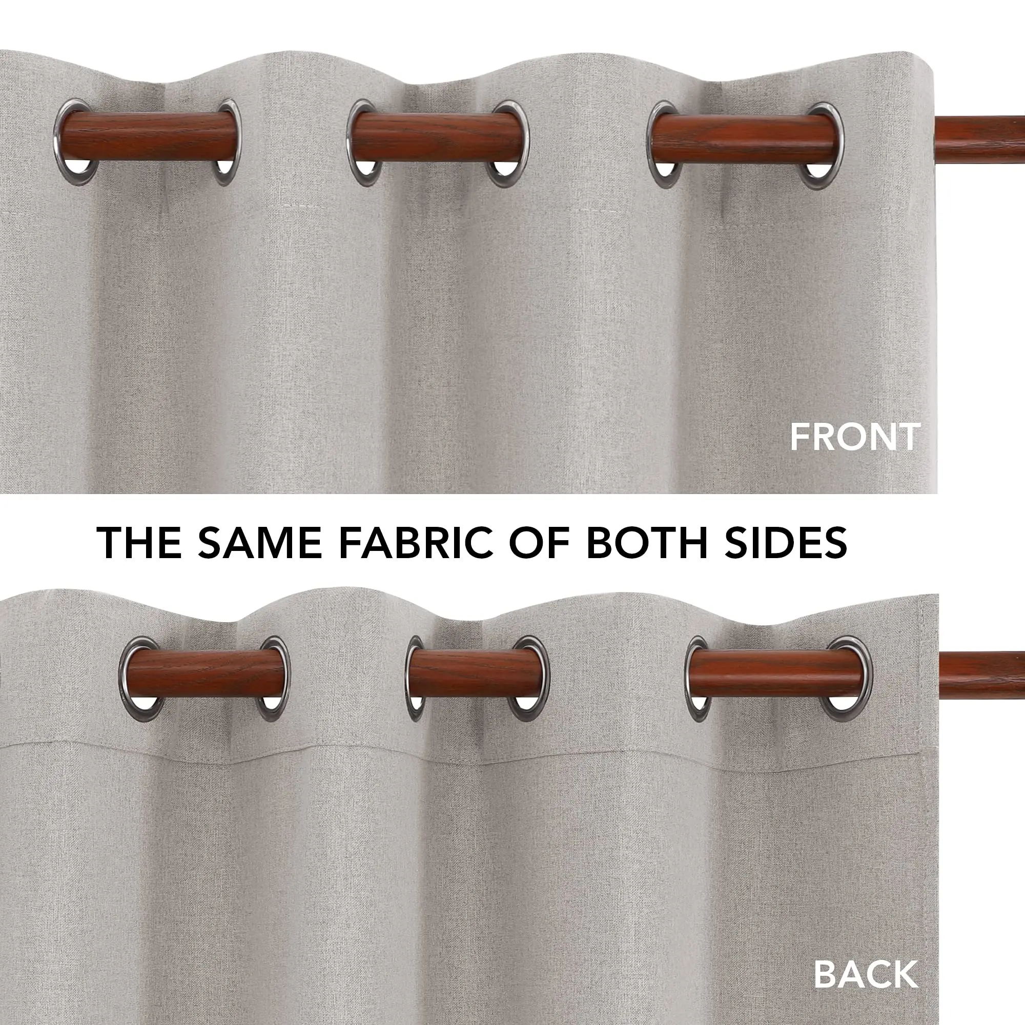 The curtains are made by faux linen fabric, simple, natural, and durable. Same color on both sides makes the curtain panel look good from other side of the window as well.