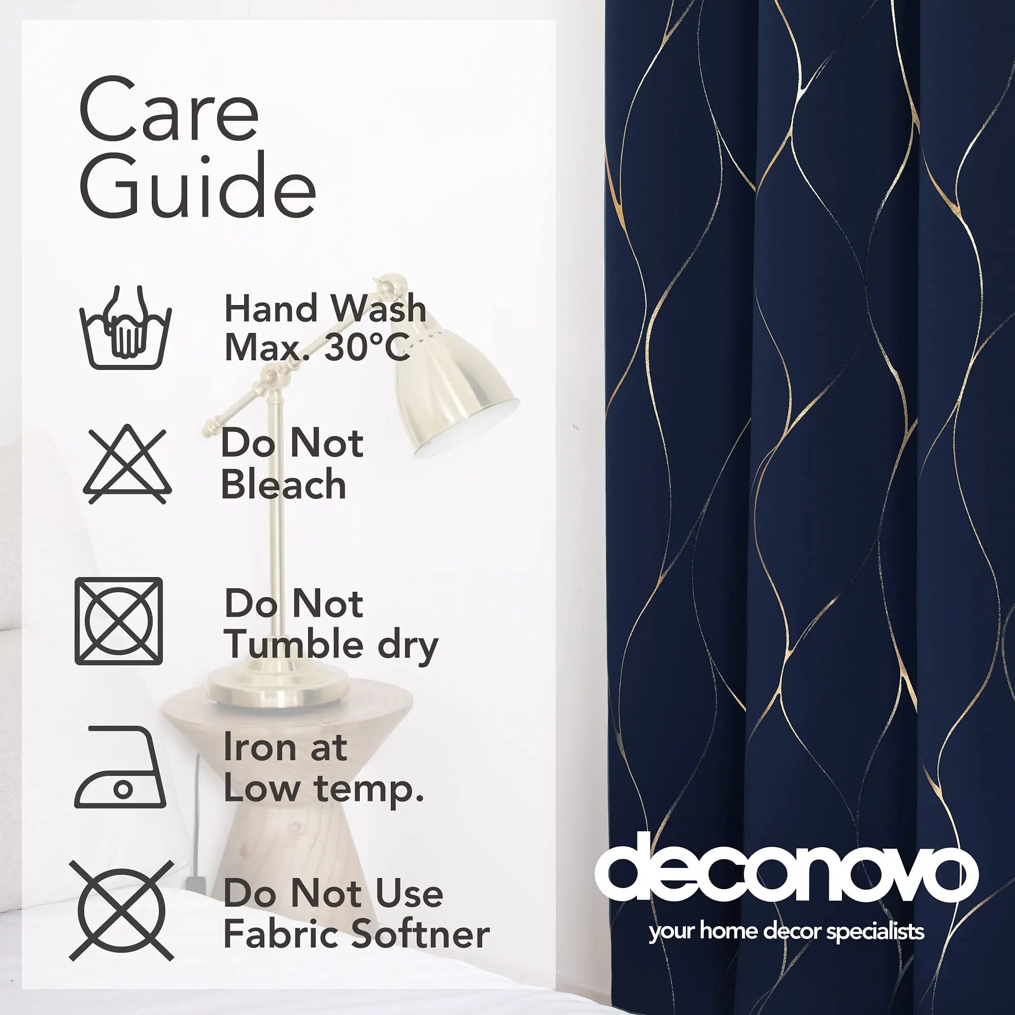 ·CARE INSTRUCTIONS - Easy care fabric ideal for an everyday usage. Not heavy, hand washable and dry quickly. Wash below 86°F. Do not bleach, do not tumble dry, iron at low temperature gently the back only.
