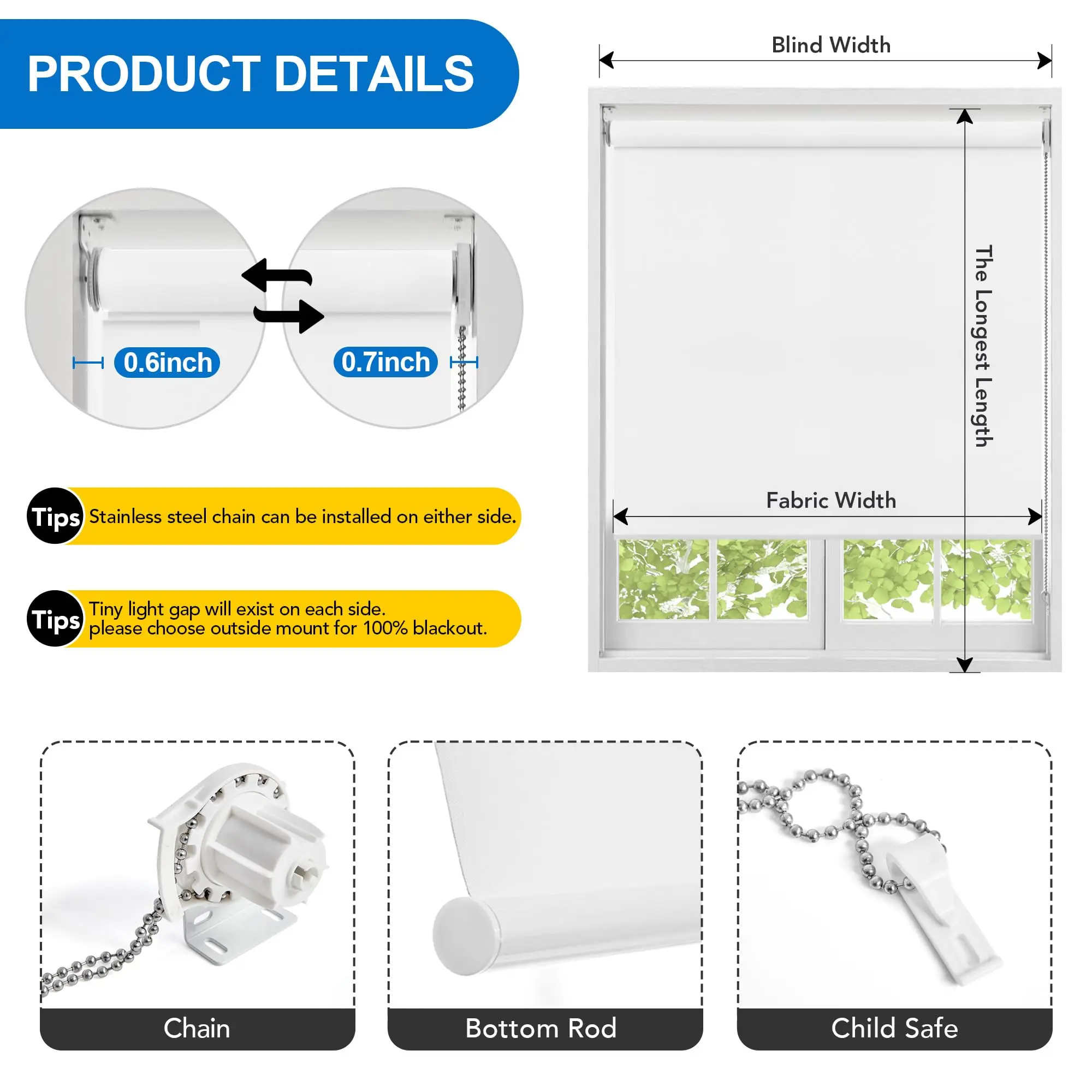 100% Blackout Roller Shades Product Details Roller window shades are simple and generous, a perfect blend for your home or office, and make a good decoration. How to Choose Outside mount shades need to be 4-6 inches wider than the window width to ensure they cover the entire window. Choose the same size as the width of the window if your window blinds are for internal installation. Excellent Material The fabric of the roller blind can provide you with 160% blackout and block UV. It has the advantages of being waterproof and moisture-proof. The edges are smooth, without burrs, and the material is wear-resistant and not easy to fade. Safety Design The cordless function is easy to use and provides peace of mind. Gently pull down and release, and the curtain can pop back to the top with ease. Hand control allows you to pull the blackout curtain to any position. Easy to Install and Maintain Our blackout roller window shades include accessories and installation instructions for convenience. Use a damp cloth and low iron to keep it clean.
