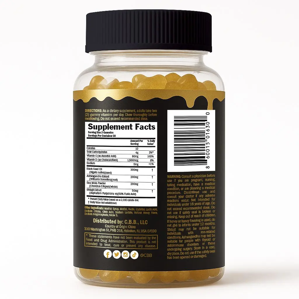 CBB offers a comprehensive wellness dietary supplement. It includes BlackSeed Oil, Shilajit, Sea Moss, and Ashwagandha Gummies. Each pack contains Vitamin C and D, providing a one-month supply of 60 gummies. Perfect for those seeking a balanced dietary supplement.