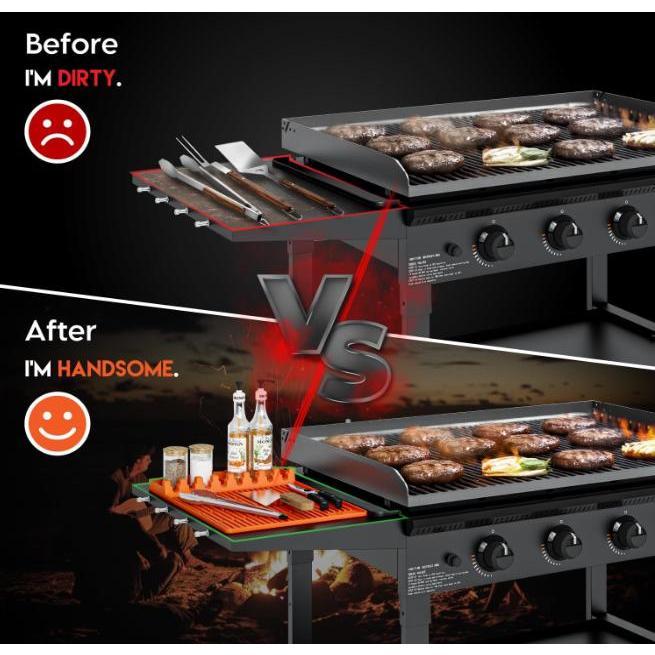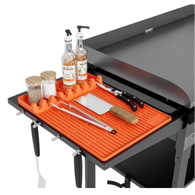 This 2-piece set includes a black stone silicone baking pan tool mat and a food-grade silicone scraper mat with a drip tray. It features a thickened edge rack, making it an essential accessory for outdoor kitchen countertops. The orange thick style adds a unique touch to your cooking setup.