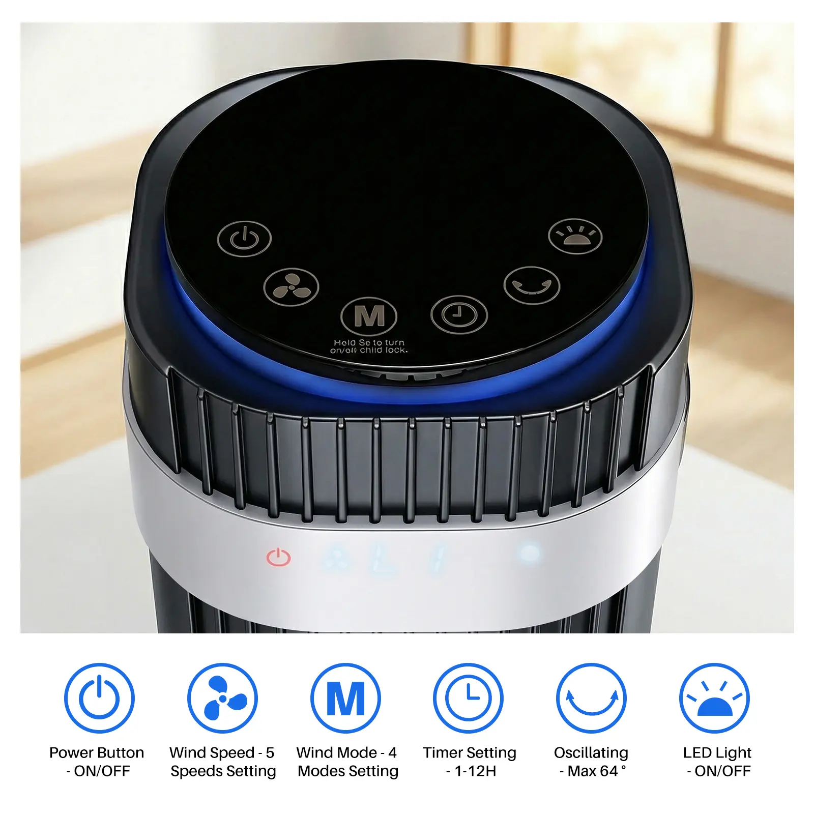·12H Timer & Effortless Control: Set the bladeless tower fan for 1-12 hours to turn off automatically, providing peace of mind during sleep or work. Dual control modes via the sensitive touch panel and long-range remote make it easy to manage at any distance
