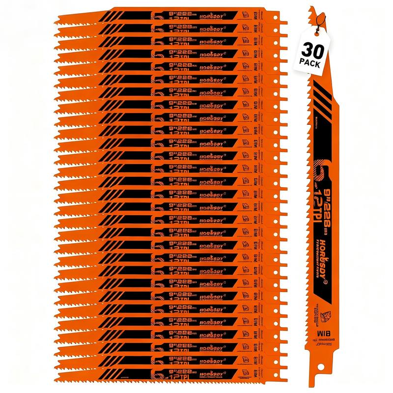 ·PRODUCT SPECIFICATIONS: HORUSDY wood pruning reciprocating saw blades include 6-12 TPI 30 pieces of 9-inch blades, with a 0.039-inch thickness