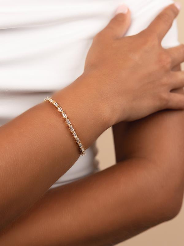 The Blanche CZ Tennis Bracelet is a fresh take on a classic. With elongated emerald-cut Hearts & Arrows CZ stones, it catches the light from every angle. Designed to be worn anytime, anywhere.