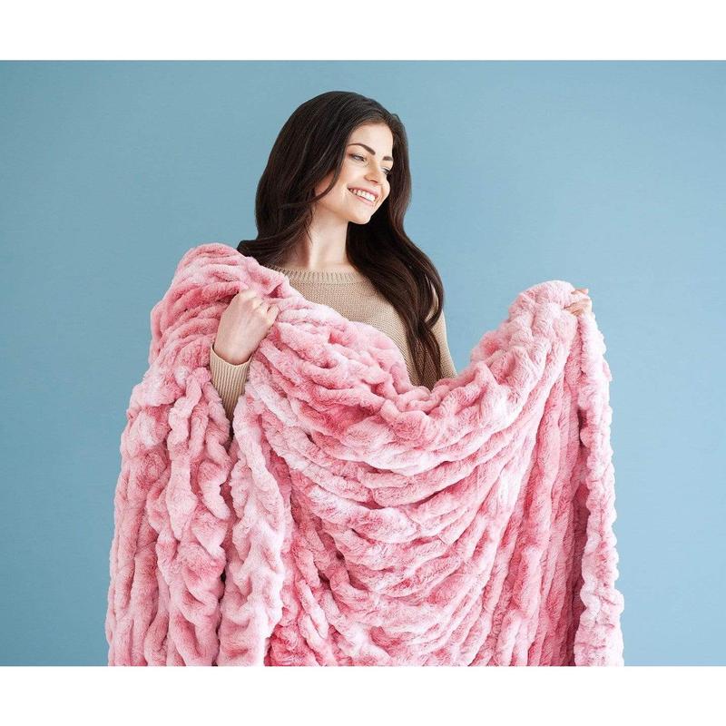 This is the prettiest shade of pink and I'm not even a pink lover. It almost seems like a watermelon or coral shades mixed and the swirled in white is gorgeous! It is every bit as cozy, soft and warm as the Premium Cloud line. One of the best Hugs I own!