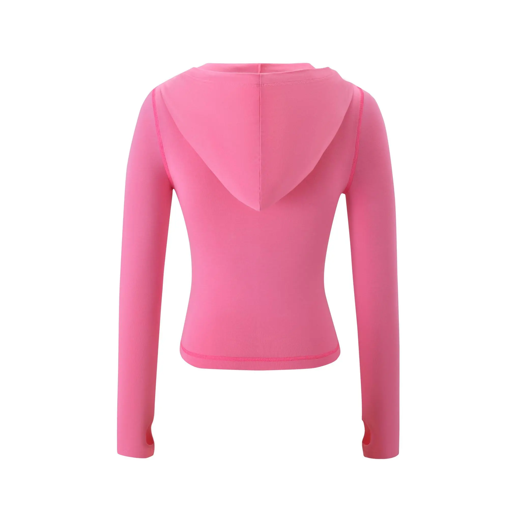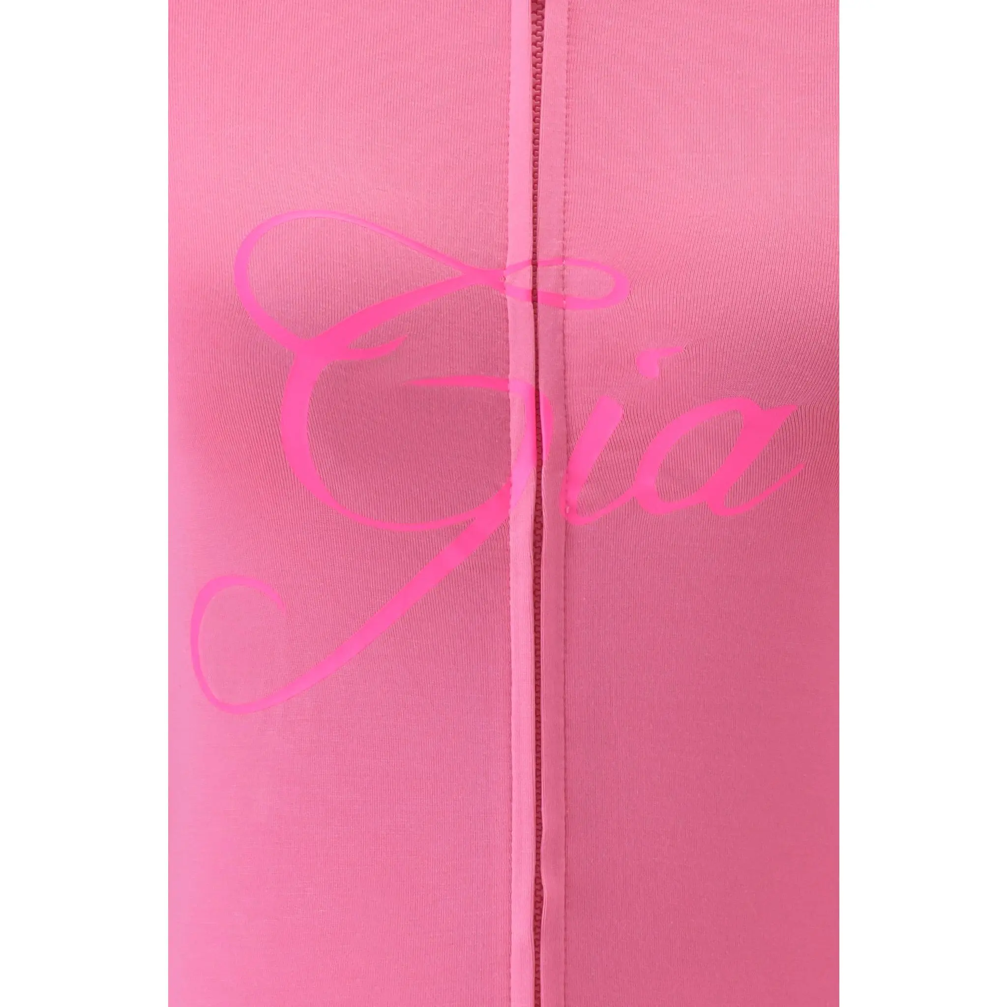 ·Bright pink hoodie with contrast neon pink GIA logo across the chest using plastisol printing technique