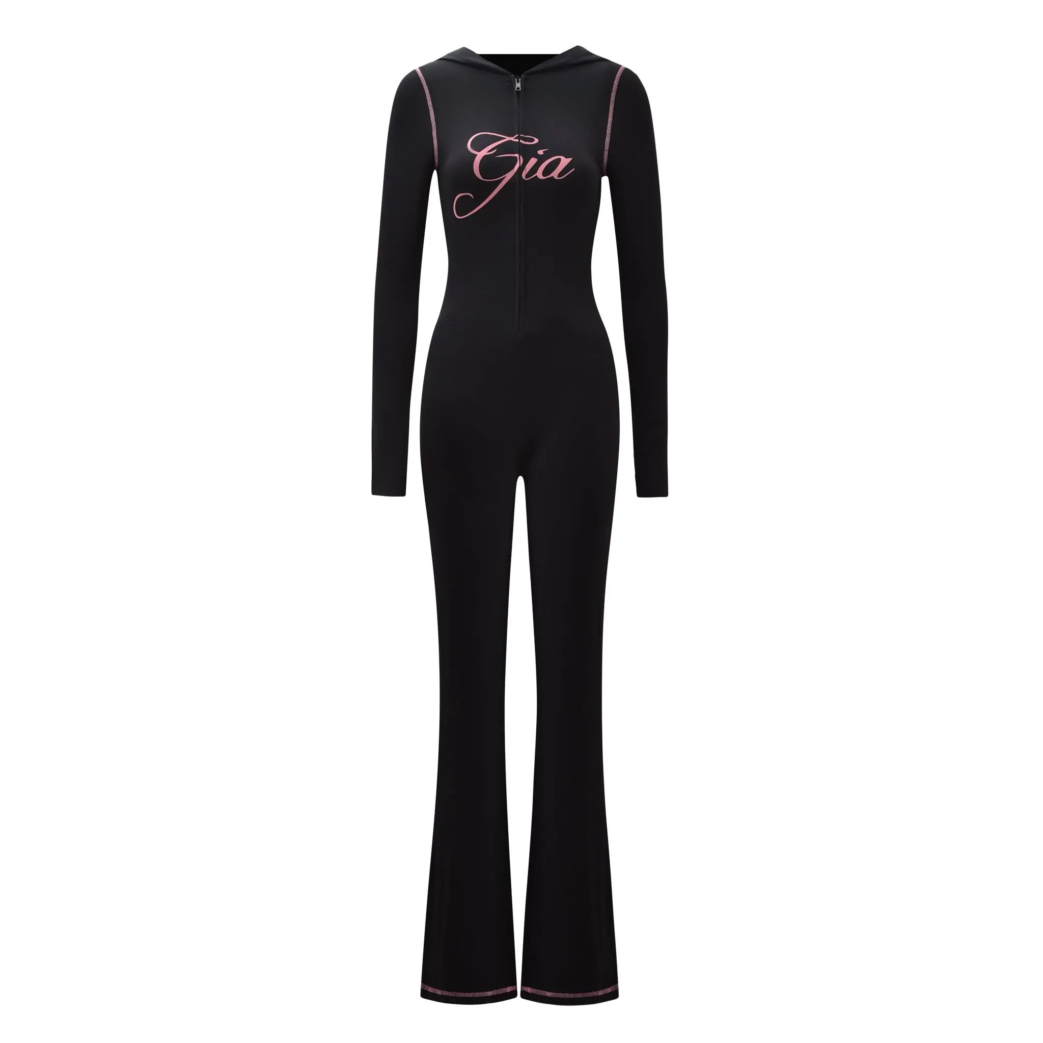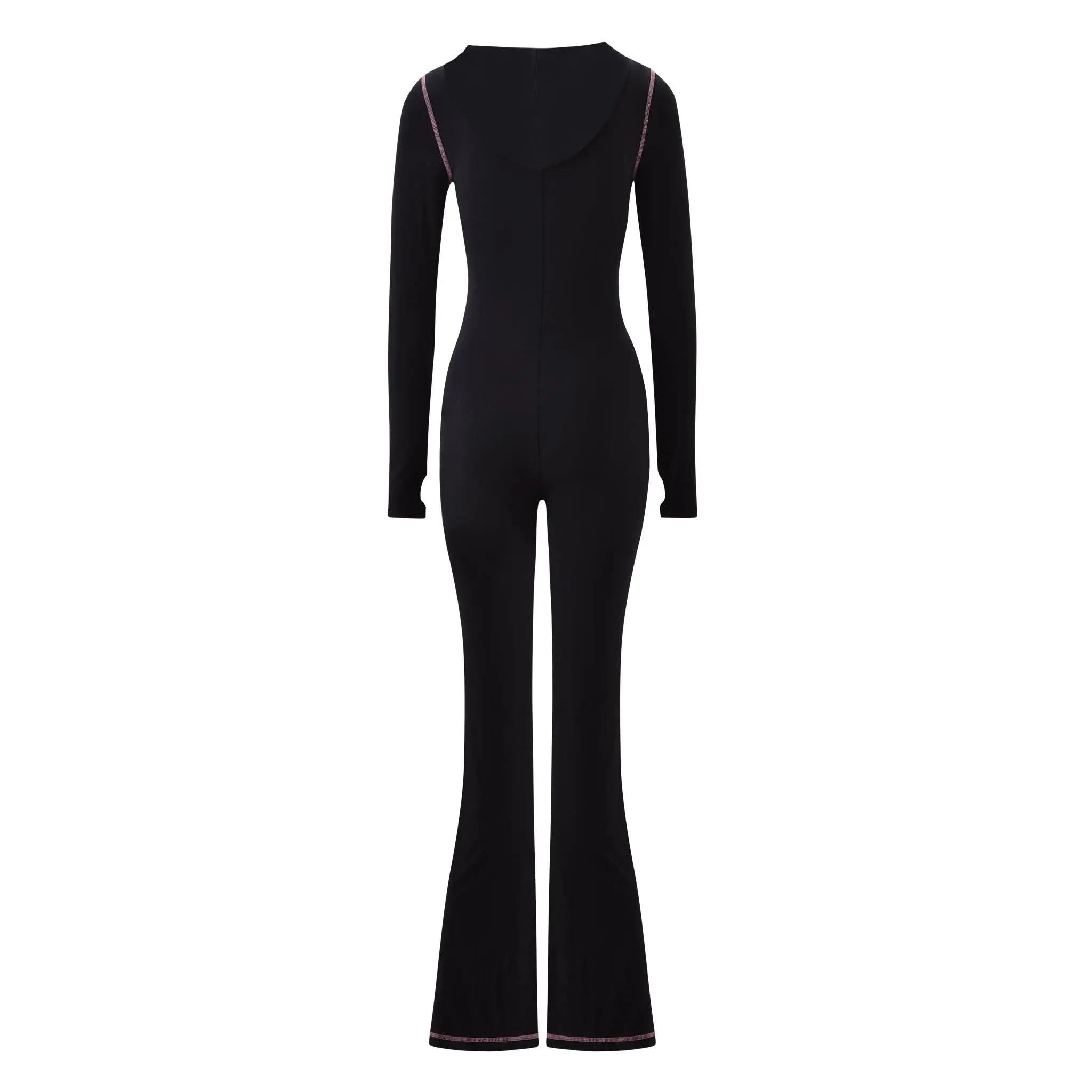 ·Long sleeve fitted hooded jumpsuit with full length flare leg pant