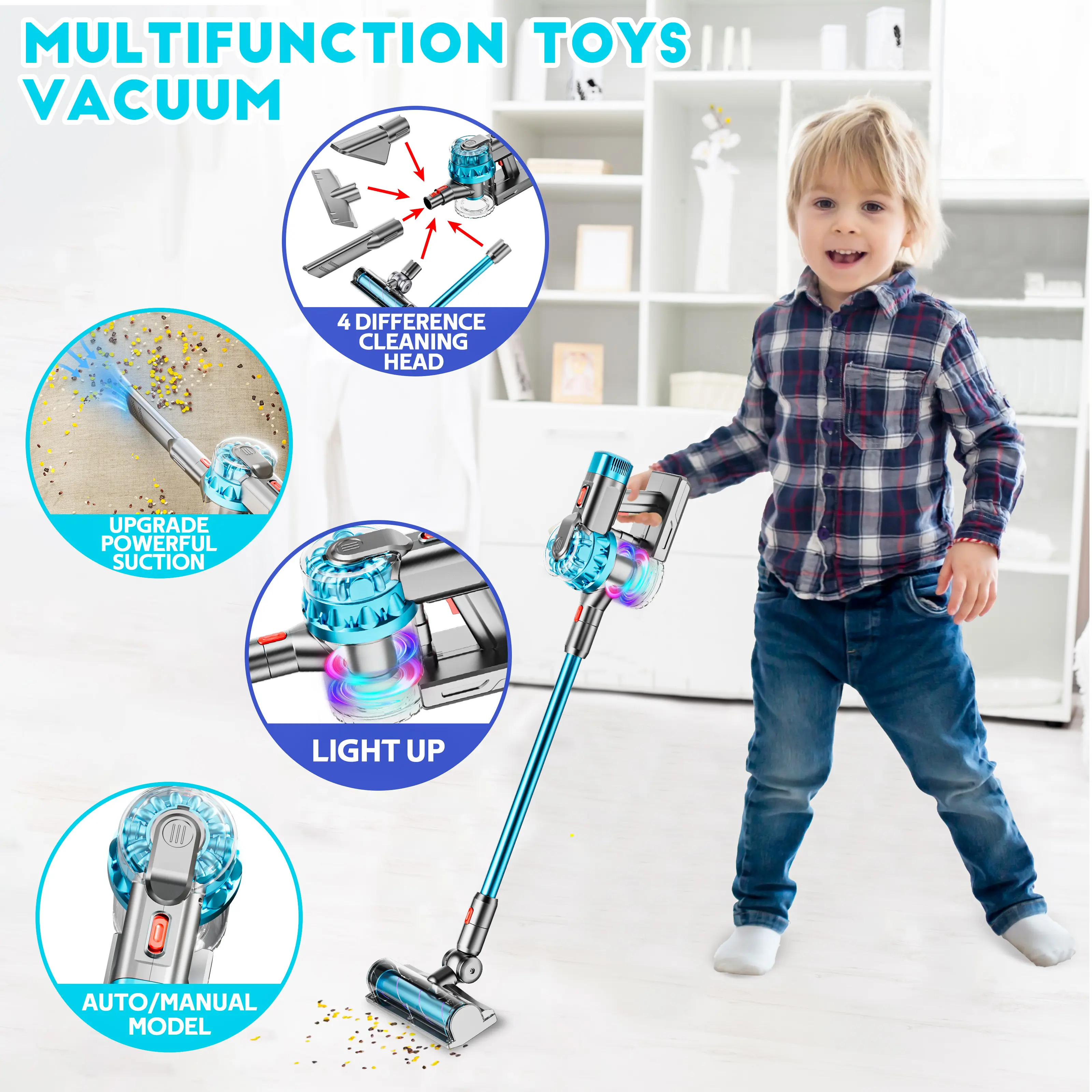 I bought it for my son, it is light weight it actually vacuums and easy to turn on and off it’s sounds like a vacuum. Has different attachment the only thing what I don’t like is is batteries operated I thought I would be a charger for it overall it’s a cute toy.