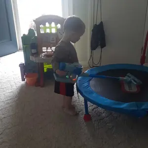 : Cool little toy but does not have suction like they claim to actually pick anything up. Makes him mad the dirt he's trying to suck up remains on the floor.