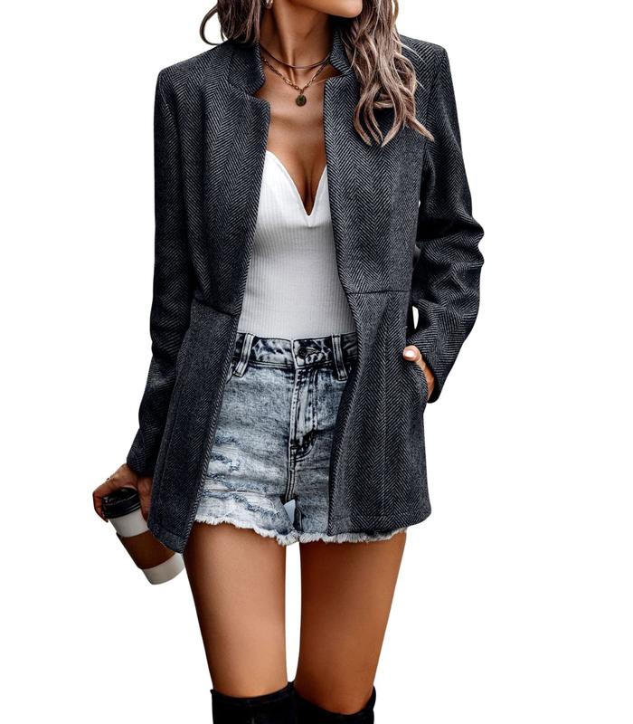 ·Basic work blazer jacket for women, featuring classic herringbone plaid pattern open front design. Solid colors: grey/ black/ apricot/ khaki/ pink/ purple available.