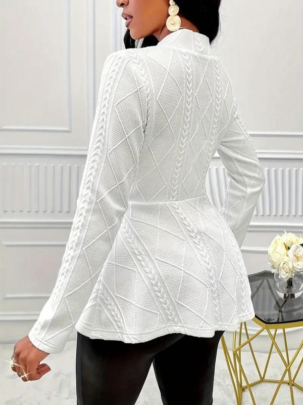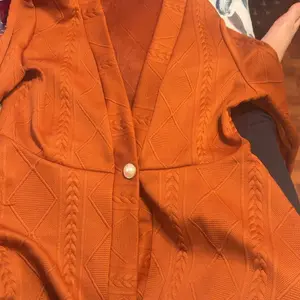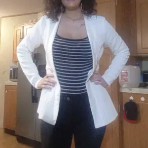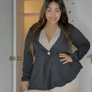 I LOVE this blazer. It's so flattering. The poplum style and pearl button detail of this jacket makes it very elegant and classy. The material is great and thick, not cheaply made at all. I wear medium tops but got a small because I wanted it to be form fitting. Highly recommend! Please like 😊❤️