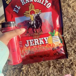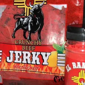 El Ranchito Jerky presents Blazing hot 2oz. This crunchy beef jerky is crafted with 100% beef, iodized salt, and maltodextrin. It features natural and artificial flavors, monosodium glutamate, and citric acid. The jerky includes a mix of chili peppers, non-hydrogenated RBD soy vegetable oil, and FD&C Red #40. It also contains added sugars, garlic, onion, inosinate, sodium guanylate, calcium silicate, silicon dioxide, and canola oil. Contains soy.