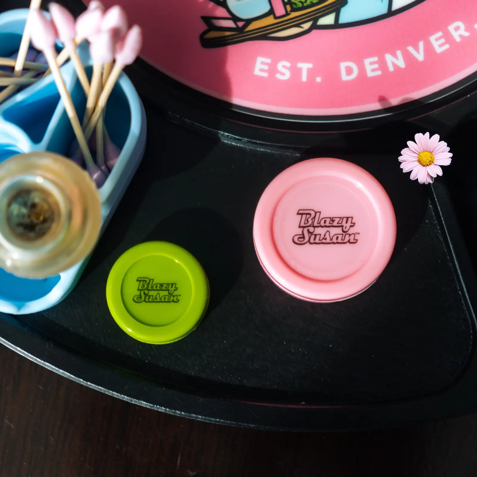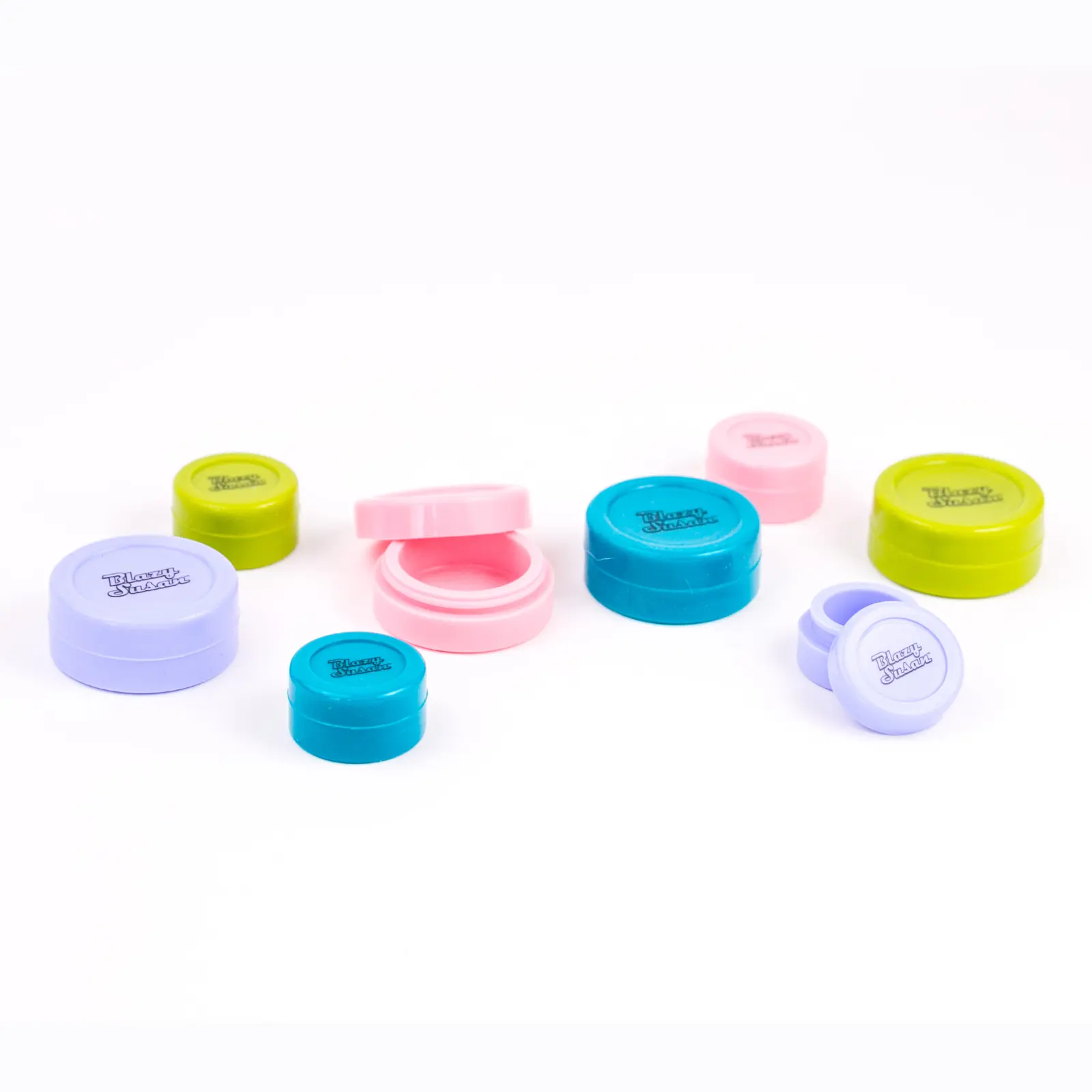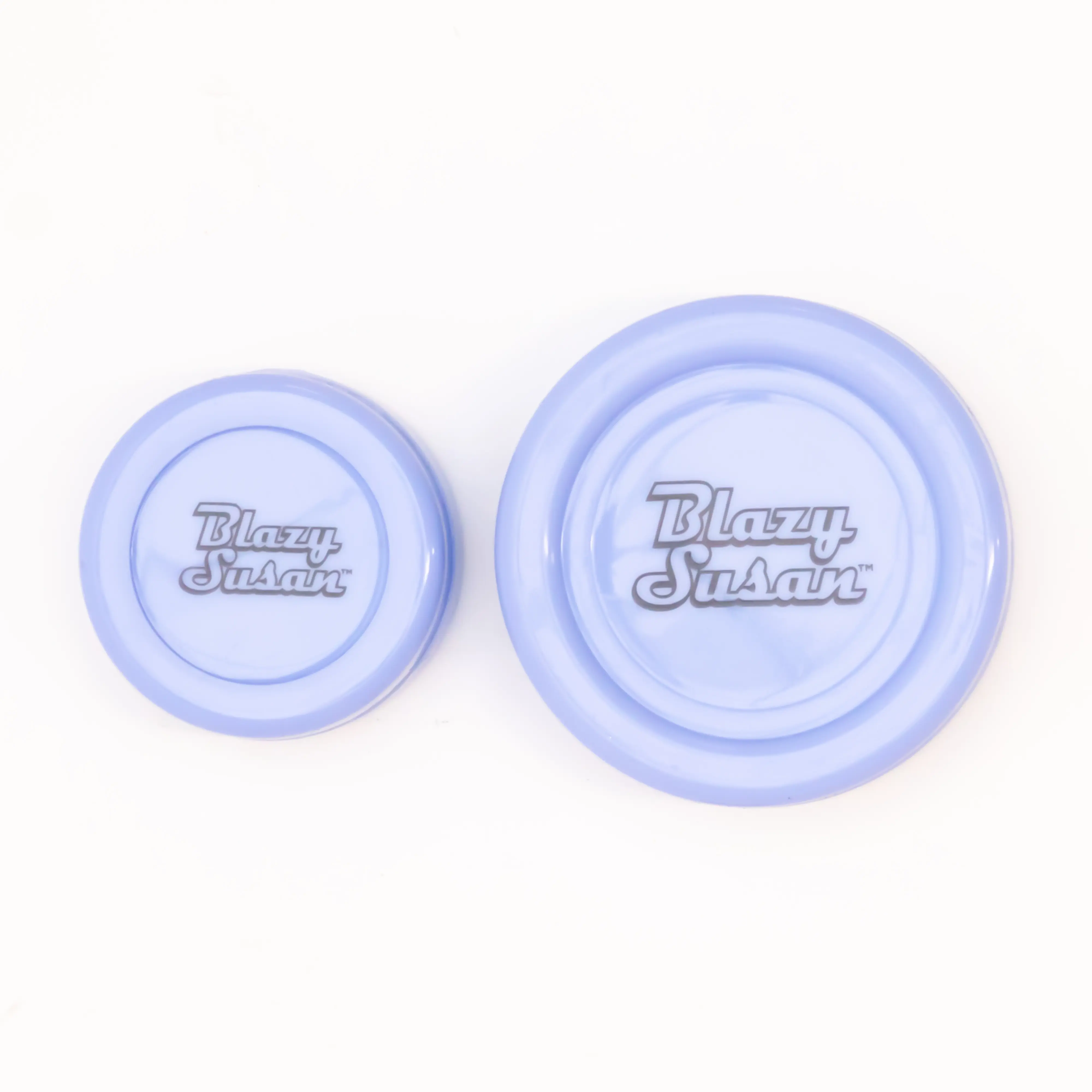 ·Color Options: Available in Pink, Teal, Green, and Purple, each featuring the Blazy Susan logo and compact design.