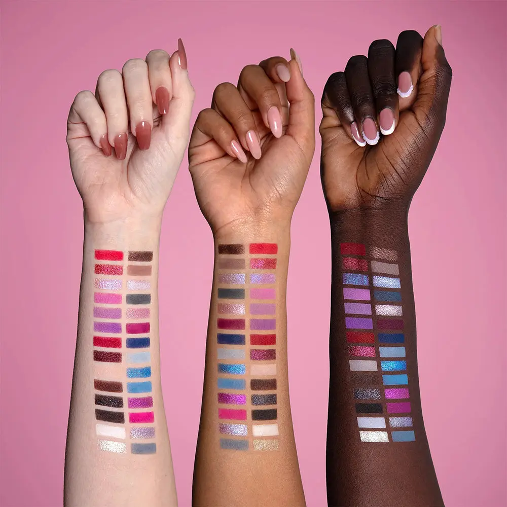 Featuring rebellious romantic shades perfect for Valentine's Day, this palette is organized in color quads and packed with personality. Comes with a plush synthetic leather case, a heart-shaped mirror, oversized black and white pans for creative freedom, and shimmering finishes that steal the show. It's artistry meets attitude in one stunning package.