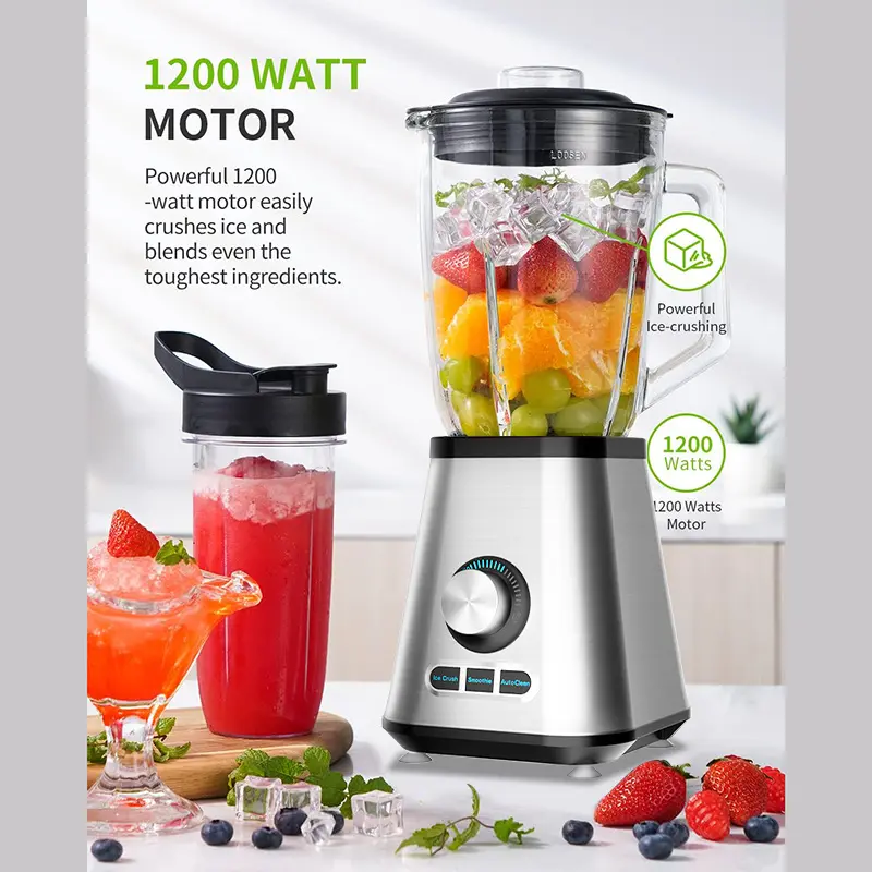 This blender combo features a powerful 1200W motor, ensuring efficient blending. The high-speed motor delivers 30,000 RPM, perfect for crushing ice, making smoothies, and blending fruits.