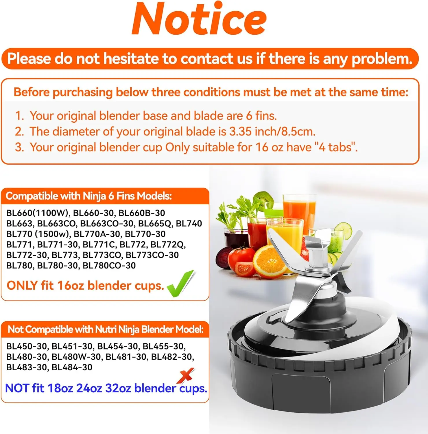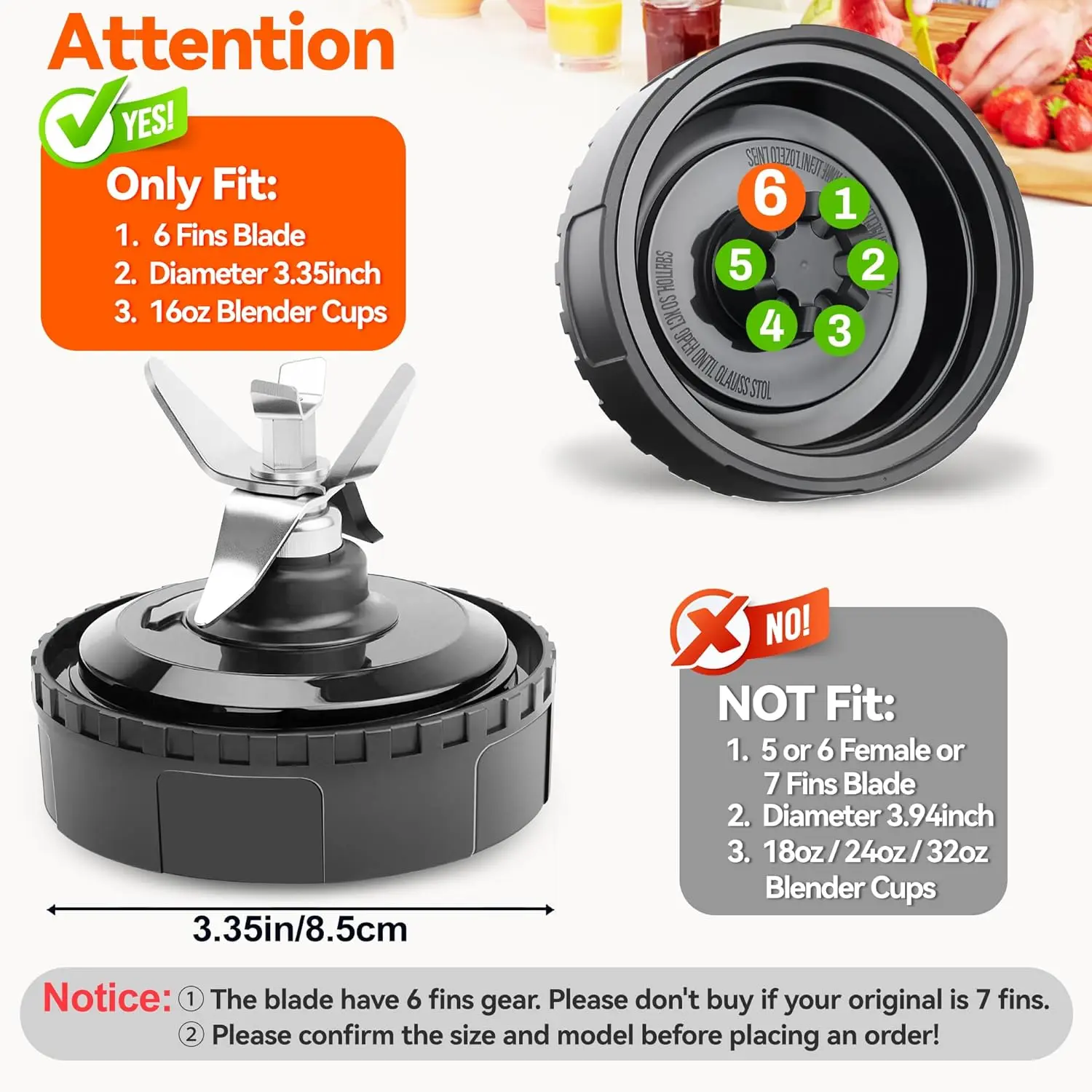 【Notes】① Please read the pictures, points, A+ content carefully before purchasing to ensure compatibility. ② The blender has 6 male fins (not 7 fins or 6 female fins). ③ Only fit for 16oz cups, not fit for 12oz 18oz 24oz 32oz cups. ④ Before use, make sure the 6 fins are firmly screwed onto the blender cup. ⑤ There is already a gasket inside the , and the gasket included in the package is extra. The gasket may come loose during shipping, please make sure it fits snugly before use