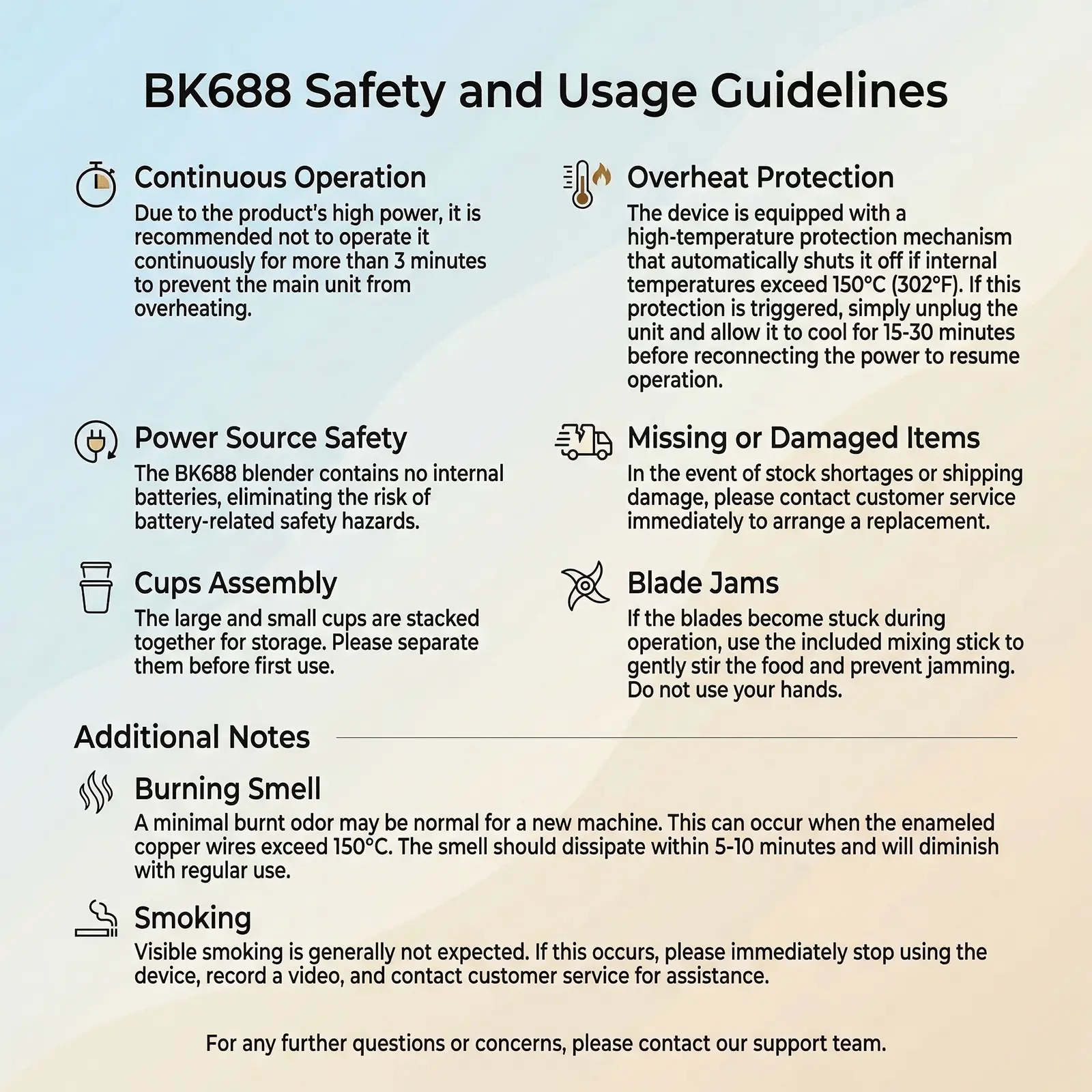 ·Power Source Safety: The BK688 blender contains no internal batteries, eliminating the risk of battery-related safety hazards.
