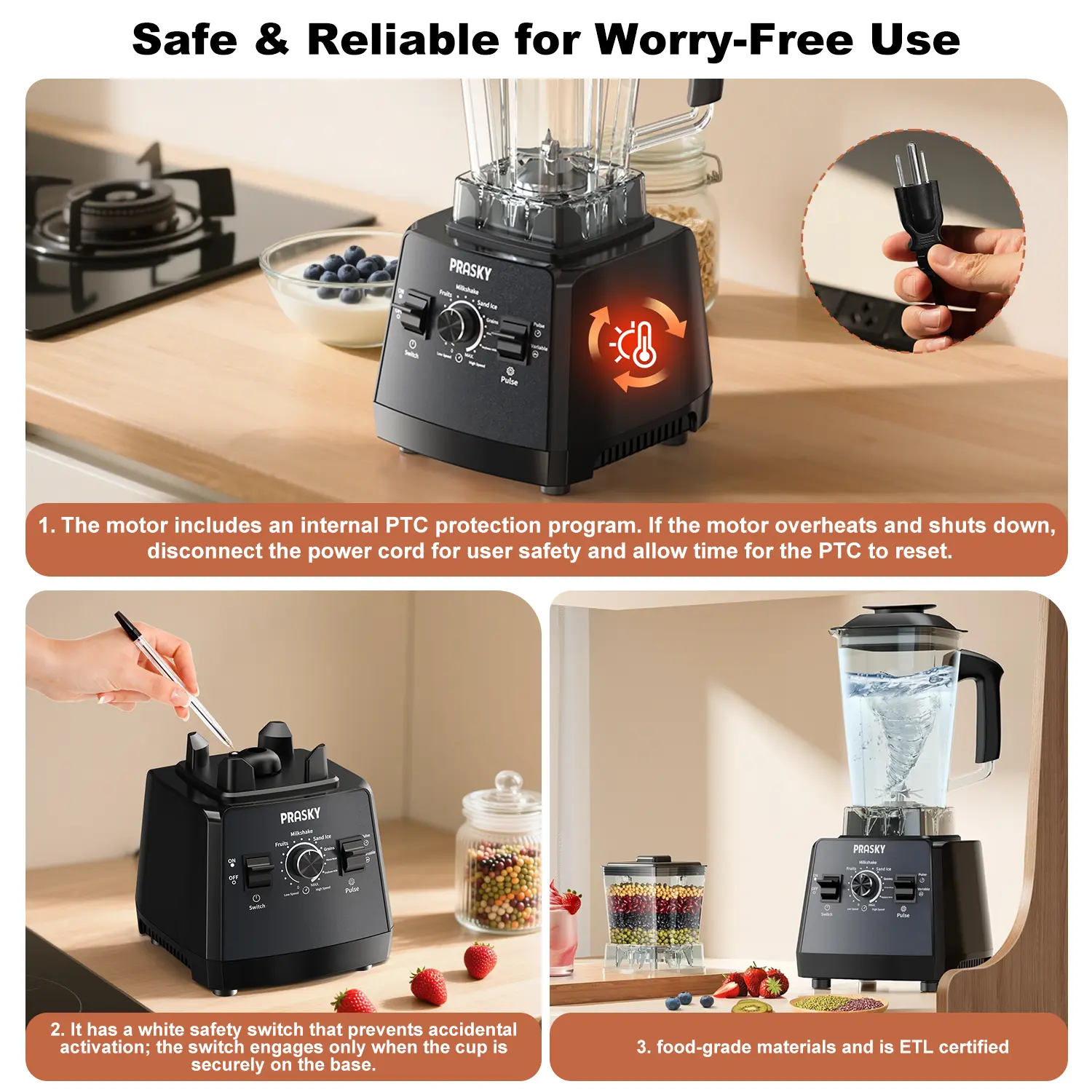 [Powerful Blenders for Kitchen]: PRASKY blender for smoothies with powerful 3.0-hp motor which reaches speeds of up to 25000 RPM/min, faster and stronger, Blenders feature an enhanced 6-leaf sharp blade which can easily crush ice cubes, vegetables and fruits.Powerful blender for smoothies and shakes are effortlessly available with just a twist
