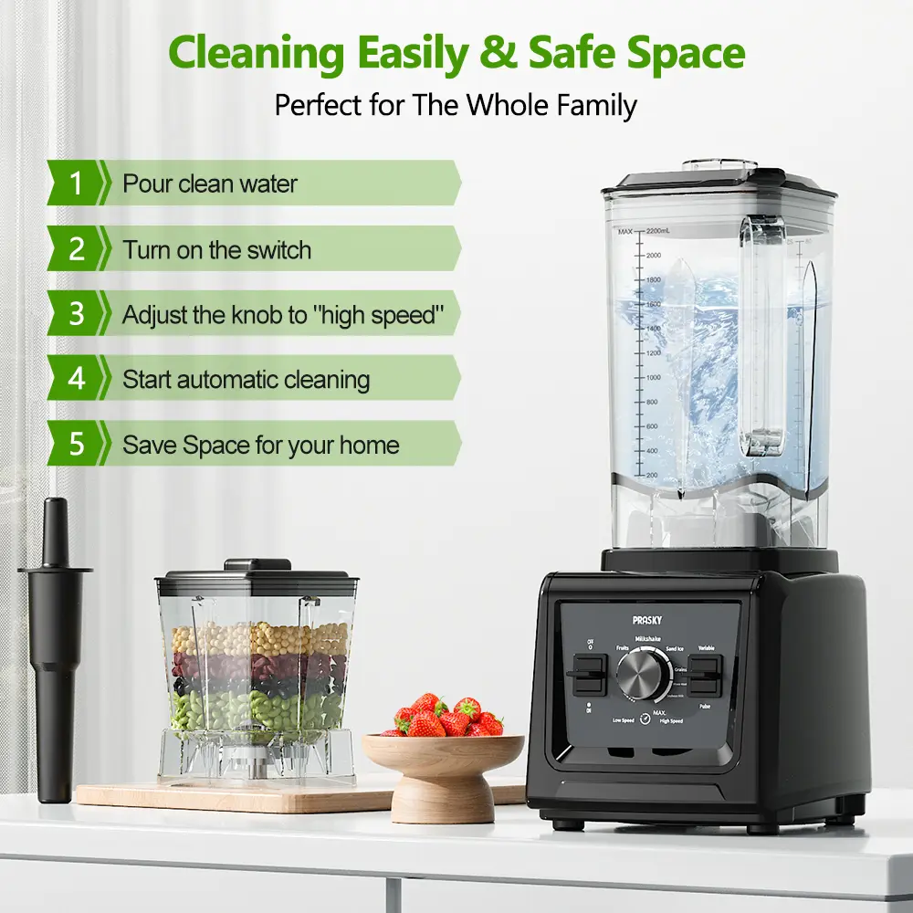 【Easy to Clean】Simply add a small amount of dish soap and warm water to the container, and the PRASKY professional blender will self-clean in 30-60 seconds with minimal splatter. For any stubborn residue, a quick manual wash will ensure it's thoroughly clean.